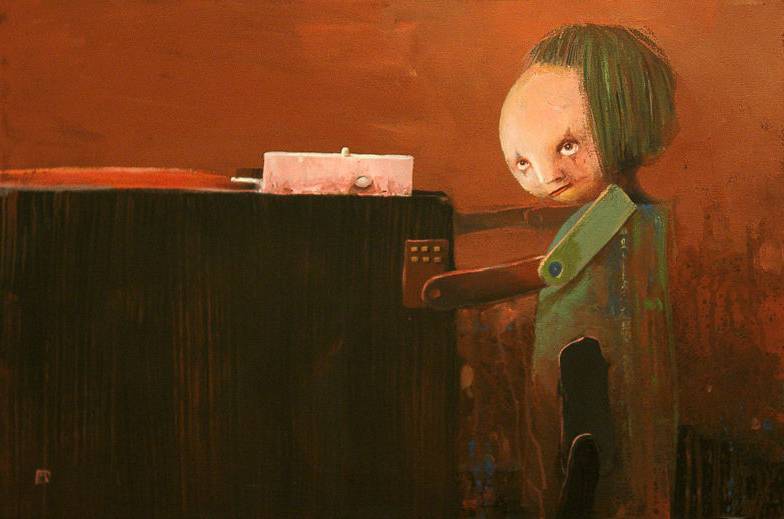 Obraz przedstawia postać dziecka stojącego przy dużym, ciemnym przedmiocie. Dominują ciepłe, brunatne odcienie, które tworzą nieco tajemniczy klimat. Kompozycja jest prosta, koncentrująca się na centralnej figurze. Dziecko ma nieproporcjonalnie dużą głowę i dość zniekształcone rysy twarzy, co nasuwa skojarzenia z surrealizmem. Wzrok dziecka jest skupiony i trochę niepokojący, co przyciąga uwagę widza. Kolory są zgaszone, nadając całości melancholijny nastrój. Artysta używa delikatnych pociągnięć pędzla, tworząc teksturę, która dodaje obrazu głębi. Trochę jakby wszystko było zanurzone w nostalgicznym "sepia dream". Malarskie techniki wskazują na subtelne połączenia między realizmem a abstrakcyjnymi formami. Dla mnie obraz ten wywołuje uczucie samotności i refleksji. Może przypominać o dziecięcej ciekawości świata, która czasem prowadzi w nieznane zakamarki. Małe dzieci powiedziałoby pewnie, że to trochę straszne. Obraz skłania do zastanowienia nad niewinnością i tajemniczością dzieciństwa. Słowo "weird" doskonale oddaje dziwaczną, choć fascynującą aurę dzieła. Naprawdę intrygujące, co kryje wnętrze tej dziwnej szafki.