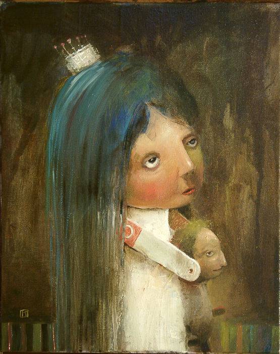 Na obrazie widzimy postać o dużych oczach, patrzącą nieco w bok, jakby zamyśloną. Jej długie, niebieskie włosy przypominają kaskadę i dodają całemu ujęciu nuty baśniowości. Mała korona na głowie sugeruje jakąś królewską historię, jak z bajki dla dzieci. Kolory są stonowane, dominują brązy i zielenie, co tworzy tajemniczy nastrój. W tle widoczna jest ciemna, niejednorodna plama, która przyciąga uwagę i buduje atmosferę marzenia sennego. Technika użyta przez artystę łączy elementy surrealizmu z nieco rustykalną fakturą farby. Obraz ma w sobie coś z dream-like quality z tego powodu może wywoływać uczucie nostalgii albo zadumy. Jednocześnie jest w nim coś dziecinnego i delikatnego, jakby opowiadał historię z dzieciństwa. Wyobraźnia widza zaczyna pracować. Czy to postać z bajki, czy może symbol tęsknoty za utraconą niewinnością? Mogę sobie wyobrazić, jak dziecko patrzące na ten obraz powiedziałoby: "Ona trzyma misia i jest smutna". Taki komentarz dodaje prostoty i szczerości do interpretacji. Osobiście, przypomina mi to dziecięce sny, pełne tajemnic i pytań. Każdy szczegół zdaje się stworzony z myślą o nostalgicznych wspomnieniach o minionym czasie.