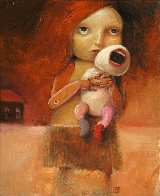Obraz emanuje niecodzienną atmosferą pełną napięcia i tajemnicy. Dominują tu ciepłe odcienie czerwieni i brązu, które tworzą nieco przytłaczający klimat. Główna postać, z wielkimi oczami i płomiennymi włosami, trzyma w rękach dziwną, przypominającą wizję dziecko, które wydaje się krzyczeć. Jego nogi są różnokolorowe, co dodaje surrealistycznego charakteru całej scenie. Kompozycja jest skoncentrowana na centrum, przyciągając wzrok do wyraźnych emocji malowanych na twarzy kobiety. Artysta posługuje się techniką impasto, co sprawia, że obraz wydaje się niemal trójwymiarowy. To wywołuje intensywne uczucie niepokoju i zastanowienia. Czuję, że patrzę na coś z innego świata. Jest w tym coś bardzo „weird” i fascynującego. Może to jakieś marzenie senne? Albo sen jakiejś lalki? Obraz może budzić ogromne emocje – od zdziwienia po lekki dreszczyk. Mały dom w tle tylko dodaje mu tajemnicy, jakby scena rozgrywała się w głębi lasu. Chciałbym wiedzieć, co się tu naprawdę dzieje. Dlaczego ta dziewczynka trzyma to dziwne coś? Mamo, to wygląda jak z bajki! Atmosfera i surrealizm są wręcz namacalne, co sprawia, że trudno oderwać wzrok.