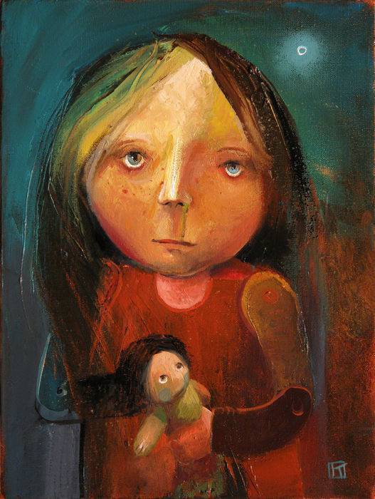 Na obrazie widzimy dziewczynkę o dużych, niebieskich oczach, trzymającą przytulankę. Tło jest mgliste i ciemne, przeważają odcienie niebieskiego i zieleni, co nadaje całej scenie aurę tajemniczości. Twarz dziecka jest oświetlona ciepłym światłem, co tworzy kontrast z chłodnym tłem i przyciąga uwagę do głównego bohatera. Artysta zastosował grube, dynamiczne pociągnięcia pędzla, co dodaje obrazowi ekspresji. Wyraźnie widać delikatne szczegóły i, co tu dużo mówić, malarską duszę. Atmosfera jest spokojna, ale jakby zawieszona w czasie. To trochę jak "czy mnie słyszysz?" dziecięcy dylemat. Patrząc na dziewczynkę, można odczuć melancholię, ale i ciepło bijące z jej postaci. To trochę jak zagubiona opowieść o dzieciństwie. Czuć w tym obrazie echo czegoś, co pozostaje niewypowiedziane. Styl artysty łączy realizm z odrobiną surrealizmu, co sprawia, że obraz intryguje i zachęca do głębszej refleksji. Może przypominać sen, który czasem trudno opisać słowami. To dzieło, które skłania do zatrzymania się i spojrzenia na świat oczami dziecka. Wow, jakie to fajne.