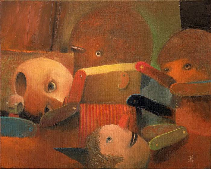Obraz emanuje dziwną, lekko surrealistyczną atmosferą. Na pierwszy plan wysuwają się figury przypominające mechaniczne lalki o dużych, nieruchomych oczach. Kolory są ciepłe, z dominacją różnych odcieni brązu, pomarańczy oraz zieleni, co nadaje pracy nostalgiczną, lekko przytłaczającą aurę. Kompozycja jest nieco chaotyczna, ale to właśnie w tym bałaganie tkwi jej urok. Artysta posłużył się techniką, która przypomina nieco styl impresjonistyczny. Pędzle są wyraźne, a ich ruchy dynamiczne, co sprawia, że powierzchnia obrazu wydaje się niemal żyć. Dzieło może budzić w widzu mieszane emocje. Z jednej strony jest coś ujmującego w postaciach, które wyglądają jak wyciągnięte z dziecięcego koszmaru, a z drugiej - ten niepokój jest intrygujący. Myślę, że to image mógłby być ilustracją do opowieści o zagubionych zabawkach. 7-letnie dziecko powiedziałoby pewnie: "Te lalki wyglądały jak z bajki, ale trochę się boję!" Styl obrazu jest nieco staromodny, ale to właśnie "vintage" vibe sprawia, że przyciąga oko. Przyglądając się dłużej, można odnieść wrażenie, jakby postacie wcale nie były martwe, ale tylko zrobiły sobie przerwę w zabawie.