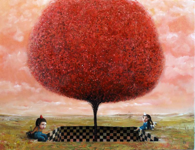 Obraz przedstawia surrealistyczną scenę, która przyciąga wzrok swoimi intensywnymi kolorami. Dominującym elementem jest ogromne czerwone drzewo, rozpościerające się na tle pastelowego nieba. Jego korona przypomina puchatą chmurę z fraktalnymi maźnięciami farby, co nadaje jej charakter niemal magiczny. Pod drzewem znajduje się dziwaczna, czarno-biała szachownica zagłębiona w ziemi, która kontrastuje z ciepłymi tonami otoczenia. Po obu jego stronach siedzą dwie postaci, które wydają się być zagubione w świecie swych własnych fantazji. Atmosfera obrazu jest zarówno nostalgiczna, jak i pełna tajemniczości. Wprowadza widza w stan onirycznego zawieszenia między baśnią a rzeczywistością. Technika artysty to prawdziwy majstersztyk łączy precyzję z miękkością pędzla, co dodaje dziełu głębii. Styl przypomina neo-surrealizm, zaskakując nas detali i niesamowitą grą kolorów. Obraz wywołuje całą gamę emocji. Odczuwalny jest spokój, ale też dziwny niepokój, jakby coś czaiło się poza krawędzią kadru. Patrząc na te postaci, można poczuć się trochę jak dziecko w krainie czarów — pełne zdumienia i ciekawości. Ciekawe, co tak naprawdę kryje się w tej szachownicy? Może to portal do innego świata. Wow! To drzewo wygląda jak wielki cukrowy wata! To artystyczne "dreamscape" zabiera nas w zupełnie inne wymiary, a ja czuję się jak Alicja z powieści Carrolla. Po prostu lovely. Obraz jest jak zaproszenie do świata wyobraźni, gdzie granice między tym, co realne, a fantastyczne zacierają się w niezwykły sposób.