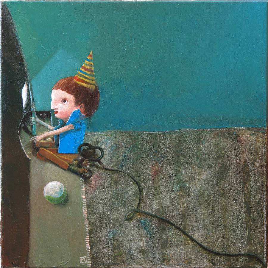 Obraz przedstawia chłopca w kolorowej, paskowanej czapeczce, siedzącego przed jakimś urządzeniem. Kolory są stonowane, dominują odcienie niebieskiego oraz ziemiste brązy, co nadaje całości nostalgiczny charakter. Kompozycja skupia się na postaci dziecka, które patrzy w ekran, jakby chciało coś odkryć. Tło jest raczej neutralne, co podkreśla centralną rolę chłopca. Artysta używa techniki olejnej, z grubymi pociągnięciami pędzla, co dodaje obrazowi tekstury i głębi. Styl jest trochę surrealistyczny, prawda? Sam nastrój jest tajemniczy, przypominający dziecięce marzenia. Z pozycji widza, ten obraz budzi mieszane uczucia. Z jednej strony jest pewna niewinność, z drugiej lekka melancholia jakby zaginiona w niektórych zakamarkach myśli. To właśnie geniusz artysty – łączy rzeczywistość i fantazję, pozwalając nam się zgubić w jego świecie. Ciekawe, jak dziecko widzi ten obraz. Może myśli sobie: "Ojejku, co to za magiczny przycisk?" Każdy element jest jakby wzięty z dziecięcej wyobraźni, a to sprawia, że obraz jest relatable i ciepły. Taki trochę oldschoolowy feel w tym jest, co przyciąga wzrok i serce. Na koniec, obraz skłania do refleksji nad dzieciństwem i jego beztroską. Czasem te proste chwile, spędzone w towarzystwie ulubionej zabawki lub urządzenia, mają największe znaczenie. To nie tylko sztuka, to okno do świata, który każdy z nas kiedyś znał.