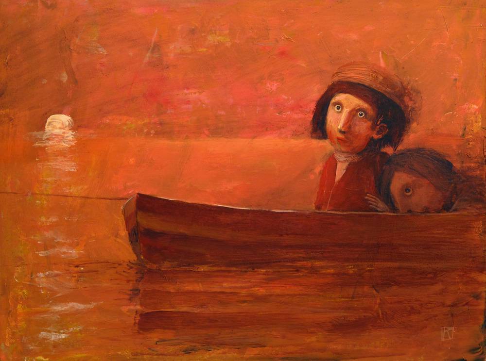 Obraz emanuje ciepłymi odcieniami pomarańczu i czerwieni, tworząc wrażenie spokoju, ale i pewnej tajemnicy. Centralnym punktem są dwie postacie w łódce, których duże oczy wpatrują się z otwartością i dziecięcą ciekawością. Kompozycja jest przytulna, jakby artysta chciał nas zanurzyć w intymnym świecie bohaterów. Tło, rozmazane i delikatnie rozmyte, przypomina złoty zmierzch nad spokojną wodą, dając wrażenie zatrzymanej chwili. Styl malarski jest swobodny, a technika może przypominać akwarelę lub farby olejne naniesione lekkim pociągnięciem pędzla. Kolory płynnie przechodzące między sobą tworzą, jakby to powiedzieć, dreamlike atmosphere. Czujemy lekką melancholię, ale i bezpieczeństwo, co jest dość sprytnym połączeniem. Artysta uchwycił moment refleksji i dziecięcej beztroski, które mogą wywołać w nas nutkę nostalgii. Patrząc na ten obraz, można poczuć zadumę, jakby wspomnienie z dawna powróciło w zmierzchowym świetle. Myślę sobie, że kiedyś też siedziałem tak w łódce z przyjacielem, snując opowieści o świecie. Dziecko powiedziałoby: "Patrzą jakby widzieli coś fajnego!" I to właśnie ta prostota dziecięcego spojrzenia odnajduje w tym dziele coś magicznego. Jedno jest pewne, obraz zachęca do odkrywania ukrytych znaczeń i zatrzymania się choć na moment, tak po prostu, w codziennym biegu.