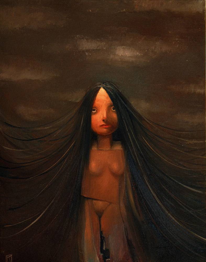 Obraz przedstawia tajemniczą, nieco surrealistyczną postać w centrum kompozycji, otoczoną głębokimi, ciemnymi tonami brązu i czerni. Wzrok przyciąga długie, czarne włosy, które rozchodzą się na boki niczym płynąca rzeka. Cała scena jest mroczna, tajemnicza, jakby malarz chciał uchwycić moment zawieszenia w czasie. Nastrój jest pełen niepokoju, co potęguje bezosobowe spojrzenie postaci. Artysta posługuje się ekspresyjnymi pociągnięciami pędzla, tworząc teksturę przypominającą niebo przed burzą. Mimo że dzieło jest w stonowanej kolorystyce, to technika warstwowego nakładania farb sprawia, że powierzchnia obrazu wydaje się pulsować własnym życiem. Stylem można to porównać do surrealizmu z nutą ekspresjonizmu, gdzie sen miesza się z prawdą. Odbiorca może poczuć zarazem ciekawość i lekkie przerażenie. Co ta postać ma w głowie? Z kim się wydaje rozmawiać w tej ciszy? Dla mnie wywołuje uczucie zagubienia, jakby wołała do nas z głębi własnych myśli. Dzieciak by powiedział: "Ooo, ta pani ma włosy jak meduza!" Takie skojarzenia łączą się z dziecięcą wyobraźnią. Może to jest symbol loneliness w tłumie. To dzieło prowokuje, zmusza do refleksji, a jednocześnie zostawia odbiorcę z niepokojącym pytaniem bez łatwej odpowiedzi.