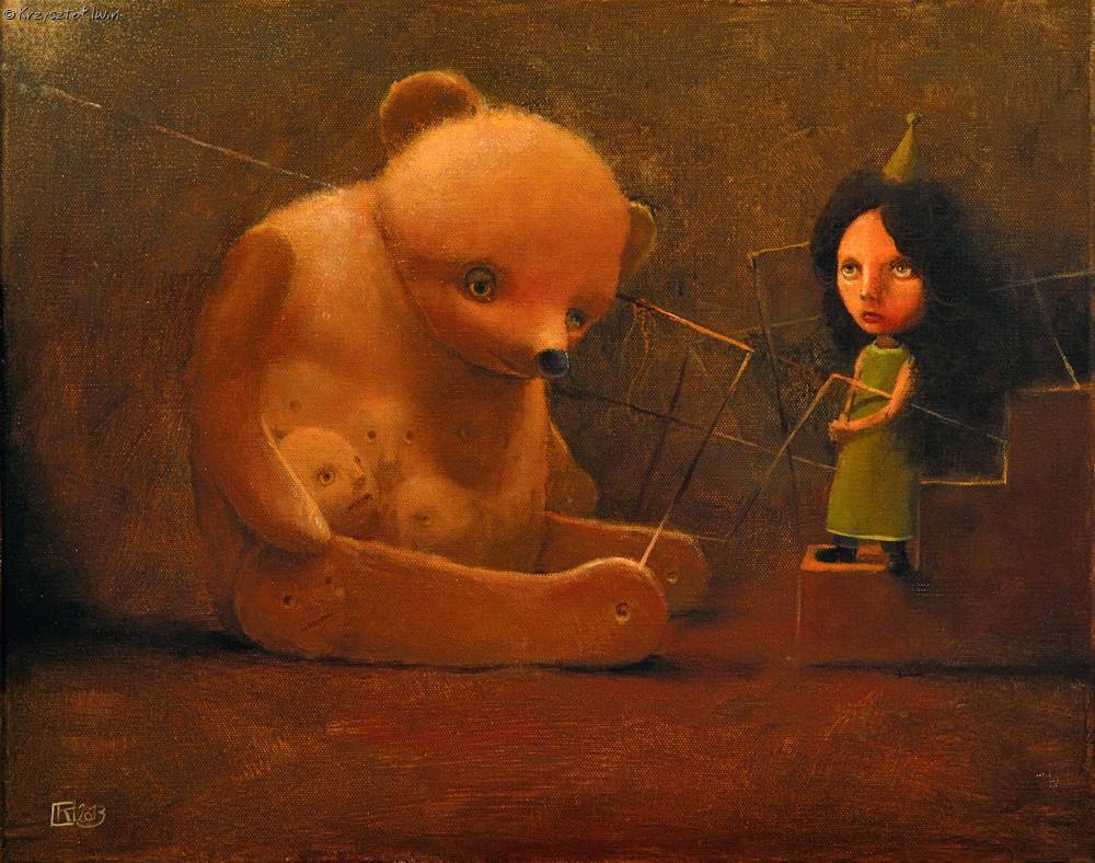 Obraz emanuje nieco mrocznym, surrealistycznym klimatem, który od razu przykuwa uwagę. Na pierwszym planie widzimy ogromnego misia. Jest spory, zrobiony z czegoś jakby plusz. Utrzymany w ciepłych, przygaszonych odcieniach brązu i beżu. Na jego brzuchu widać dziwnie wpatrzone oczy i twarze, co dodaje kompozycji elementu niepokoju. Obok misia stoi mała dziewczynka na drewnianych stopniach. Ubrana w zieloną sukienkę, a na głowie ma szpiczasty kapelusik. Jej wyraz twarzy jest pełen zamyślenia, a może trochę smutny. Atmosfera? Niby magiczna, ale z nutą melancholii. Wszystko to zamknięte w ciepłej, kojącej tonacji brązów. Technika artystyczna sugeruje użycie miękkich pociągnięć pędzla, co nadaje całości oniryczny wygląd. Trochę jak ilustracja z książki dziwnej bajki. Patrząc na obraz, można poczuć mieszankę nostalgii i tajemnicy. Czy to smutne, czy piękne? Nie wiem, ale ma coś w sobie. The uncanny element of the painting prowokuje do zastanowienia: co autor chciał przekazać? Jest w tym nutka dziecięcej naiwności, ale i coś bardziej dorosłego. Jakby misiu był strażnikiem jakiejś tajemnicy znanej tylko tym, którzy potrafią patrzeć głębiej. Ja bym chciała takiego misia w swoim pokoju, ale trochę się boję. Całość jest jak sen, z którego nie chcesz się obudzić, mimo iż jest trochę creepy. Myśli krążą, a wyobraźnia płynie, pozostawiając odbiorcę z pytaniami bez odpowiedzi. To jak oglądanie swoich myśli odbitych w lustrze innej rzeczywistości.