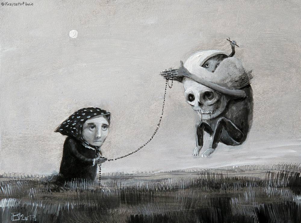 Obraz jest ciekawy. Dominują w nim szarości, przetykane ciemnymi plamami, które nadają całości nieco mroczny, tajemniczy nastrój. Pierwsze, co przykuwa uwagę, to postać z chustką na głowie. Jej smutne oczy patrzą na coś niesamowitego—siedzącą sylwetkę z czaszką, miejsce na styku rzeczywistości i snu. Kompozycja zdaje się prosta, ale każde spojrzenie odkrywa nowe szczegóły. Ten niepokojący gość, wciśnięty w surrealistyczny kadr, przykuwa uwagę jak horror-przygoda. Artysta operuje techniką, która przypomina nieco grunge. Ostre pociągnięcia pędzlem kontrastują z subtelnością emocji zawartych w twarzach postaci. Użycie black and white nadaje pracy nostalgiczną nutę, jakbyśmy oglądali old photograph ze wspomnieniami z przeszłości. Każdy może poczuć się tutaj nieco zagubiony—dzieciak rzekłby "On wygląda jak duch, ale żyje?" Obraz prowokuje do refleksji. Czy mamy tu do czynienia z opowieścią o życiu, śmierci czy może o czymś jeszcze innym? Osobiście poczułem lekki dreszcz niepokoju, ale i fascynacji. Coś w tym miksie dosadności i delikatności sprawia, że trudno oderwać wzrok. Wciągająca gra świateł i cieni nadaje mu głębię. Uczucia, jakie płyną z obrazu, są złożone jakby porysowane przez proste ale głębokie emocje.