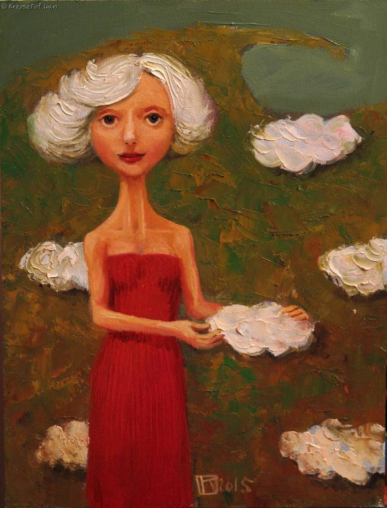 Obraz tętni życiem i subtelnymi odcieniami. Przedstawia kobietę o długiej szyi i jasnych włosach, odzianą w czerwoną suknię. Jej suknia jest nasycona żywym kolorem, kontrastującym z zieloną, fakturowaną powierzchnią tła. Wokół niej unoszą się białe chmurki, które wydają się nieco surrealistyczne, jakby artysta bawił się z rzeczywistością. Atmosfera obrazu jest magiczna, lekka, przypomina sen, gdzie granica między jawą a fantazją się zaciera. Technika malowania jest impastowa, z widocznymi pociągnięciami pędzla, które nadają całości teksturę i dynamikę. Czuję, jakbym patrzyła na marzenie, które mogło przyśnić się dziecku. Wow, to jak niebo w domu! Emocje rodzą się tu z prostoty form i bogactwa kolorów. Ktoś może zobaczyć w tej kobiecie uosobienie wolności, inni - wewnętrznego spokoju. Ta wizja zaklęta w chmurkach maluje uśmiech na twarzy. To myśli, które kłębią się swobodnie w głowie twórcy i odbiorcy. Jeden element zaskakuje - subtelny urok, który nie pozwala oderwać oczu. Is this a dream or reality? Mistrzowskie połączenie kolorów i form daje wrażenie, jakbyśmy mogli dotknąć tych chmur. Trudno oderwać wzrok, prawda?