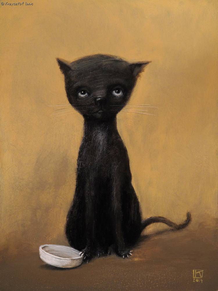 Ten obraz jest naprawdę uroczy. Na złoto-brązowym tle widzimy smutnego, ciemnoczarnego kota. Jego futro jest nieco rozmyte, co dodaje tajemniczości. Kot patrzy na nas wielkimi, melancholijnymi oczami, które wydają się mówić: "Proszę, nakarm mnie". Pod nim stoi pusta miska, podkreślająca jego bezbrzeżny głód. Całość jest raczej minimalistyczna, ale bardzo sugestywna. Artysta posługuje się delikatnymi pociągnięciami pędzla, które nadają obrazowi nieco zamglonego wyglądu. Jego technika to magiczny realizm - pewnie by się to spodobało fanom "fantasy". Nastrój obrazu jest melancholijny, ale zarazem ciepły. Przypomina wieczorne spotkanie przy kominku, kiedy wspominamy stare czasy. Dla mnie, ten kotek to symbol samotności. Puste naczynie wydaje się wołać o uwagę i troskę. Wiesz, co to znaczy mieć kota? To nie tylko obowiązek, ale i mnóstwo miłości. Czasem, patrząc w takie oczy, czujesz, że ten mały stwór rozumie więcej, niż mógłbyś przypuszczać. To jest "heartwarming". Dzieci mogłyby powiedzieć, że kot jest smutny, bo nie ma swojej ulubionej zabawki. To zabawne, jak taki prosty obraz potrafi wzbudzić tyle różnych emocji i przemyśleń. Ja, patrząc na nie, czuję spokój i nutkę nostalgii.