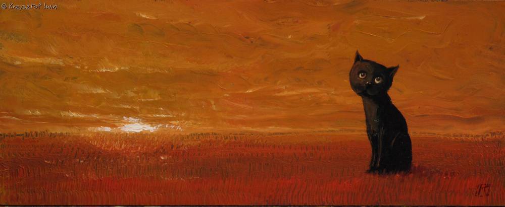 Obraz przedstawia urokliwego czarnego kota siedzącego na tle złocistego, jesiennego nieba. Dominuje ciepły kolor pomarańczowy, który wprowadza nastrój spokoju i tajemniczości. Kot ma wielkie, błyszczące oczy, które zdają się patrzeć wprost na widza, wywołując uczucie czułości i ciekawości. Obramowanie krajobrazu jest subtelne, a ziemia pełna ciemnorudych, prawie czerwonych tonów. Atmosfera obrazu jest magiczna, lekko melancholijna. Artysta zastosował technikę impasto, tworząc wyraźną teksturę widoczną na niebie, co dodaje kolejny wymiar do tej pięknej sceny. O! Chciałbym tam siedzieć z tym kotkiem i po prostu patrzeć. Obraz wywołuje refleksje nad ulotnością chwil, nad pięknem prostych chwil spędzonych w ciszy. Stylistycznie to miks surrealizmu i realizmu—taka mieszanka dreams i rzeczywistości. Można poczuć ciepło ostatnich promieni słońca odbijających się od ciemnego futra kota. Kompozycja jest wyważona, ale zarazem pełna emocji; nie potrzeba słów, by to poczuć. Feels like ten kotek ma jakąś tajemnicę ukrytą w tych oczach, którą chciałby się podzielić. Patrząc na ten obraz czuję spokój i zastanawiam się, co myśli ten mały przyjaciel na tym pustkowiu.