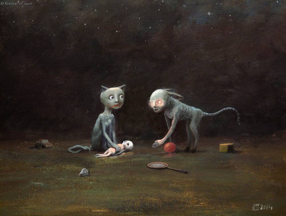 Obraz przedstawia dziwaczną scenę w mrocznym, tajemniczym otoczeniu. Dwa postacie o niecodziennym wyglądzie przypominają stwory z pogranicza jawy i snu. Kolorystyka obrazka jest stonowana, dominują ciemne brązy i szarości, z niewielkimi akcentami czerwieni i błękitu. Na pierwszym planie znajduje się czerwona piłka, rakietka i kilka innych przedmiotów, które zdają się być przypadkowo porzucone. Całość kompozycji nadaje wrażenie opuszczenia i niepewności, jakbyśmy byli świadkami jakiegoś zagubionego w czasie fragmentu. Atmosfera jest dość mroczna i zagadkowa. Obraz emanuje niepokojem, ale jednocześnie intryguje swą niezwykłością. Patrząc na niego, można poczuć się jak odkrywca tajemnic, próbujący rozwikłać historię tych postaci. Patrzysz na to i myślisz: "What’s going on here?" Styl artystyczny jest surrealistyczny, a technika z kolei wskazuje na delikatność pędzla, subtelne przejścia tonalne, co potęguje efekt nierealności. Można by rzec, że artysta posługuje się tutaj swoistym językiem wizualnym, który prowokuje do interpretacji i głębszego zastanowienia nad znaczeniem. Obraz wywołuje różne emocje - od ciekawości, po lekki niepokój. Może przypomnieć nam nasze własne sny, te nie do końca zrozumiałe. Może też skłonić do refleksji nad samotnością czy poczuciem izolacji. Dziecko może powiedzieć: „To są kosmiczne koty bawiące się lalką!”. Taki jest urok tego dzieła - każdy może zinterpretować je na swój własny sposób.