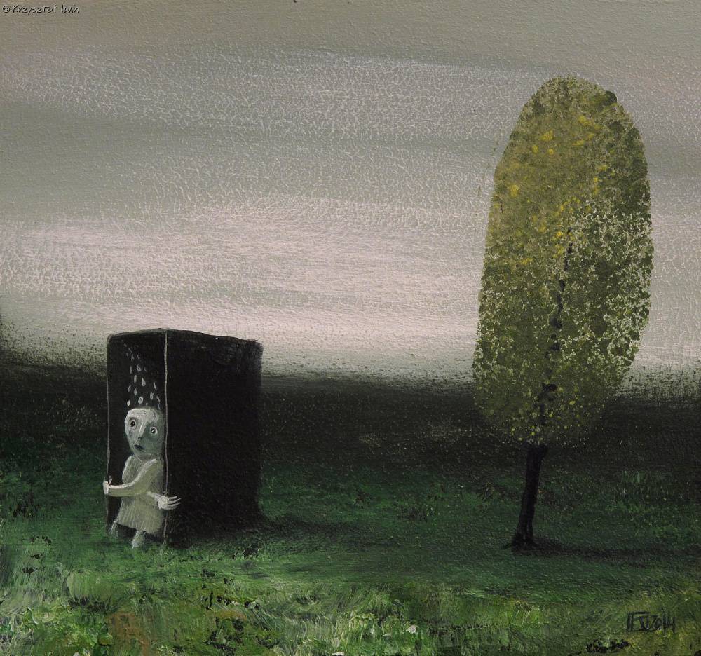 Obraz, który widzimy, to niezwykłe połączenie smutku i tajemnicy, utrzymane w stonowanej palecie szarości i zieleni. Dominują na nim subtelne odcienie tych kolorów, nadające kompozycji melancholijny nastrój. Pośrodku widzimy dziwny, czarny prostopadłościan, z którego wyjrzała mała, szara postać z szeroko otwartymi oczami przypominającymi ciekawość dziecka. Z boku, samotne drzewo wydaje się dodawać wrażenie osamotnienia, jego sylwetka lekko zamazana, jakby przysłonięta mgłą. Artystyczne pociągnięcia pędzla i technika nakładania barw przywodzą na myśl surrealizm, przez co obraz sprawia wrażenie snu lub dalekiego wspomnienia. Obraz wydaje się delikatnie pulsować emocjami – mieszanką lęku, izolacji i niewinności. Gdy na niego patrzysz, można poczuć lekkie ukłucie zimna na plecach, maybe it's the loneliness it whispers. Jest w tym coś niesamowicie emocjonalnego i nieodgadnionego. Patrząc na dzieło, chciałoby się przyłączyć do tej tajemniczej postaci, zastanawiając się, co może kryć się w środku tajemniczej konstrukcji. Całość jest niczym opowieść z odległej krainy, gdzie czas przyjmuje inny rytm. Myślę sobie: "Co to małe dziecko robi w tej dużej skrzyni? Czy to jego bezpieczne schronienie, czy może pułapka własnych myśli?" Ten obraz to prawdziwe zaproszenie do refleksji, pozostawiające widza z licznymi pytaniami i własnymi interpretacjami.