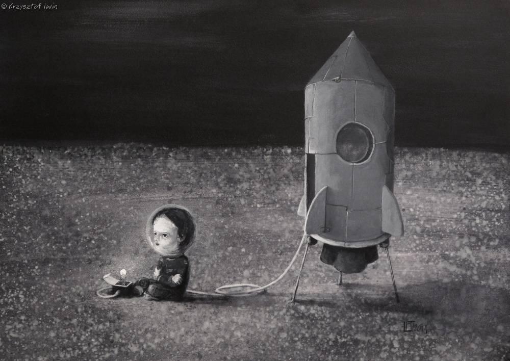 Obraz przedstawia młodego astronautę siedzącego na powierzchni czegoś, co przypomina księżycowy krajobraz, obok domowej roboty rakiety. Dominujące odcienie szarości budują tajemniczą i nieco melancholijną atmosferę. Artysta wykorzystał kontrast między matowym tłem a delikatnym światłem wokół postaci, tworząc dramatyzm, który przyciąga wzrok. Mały kosmonauta, z dużymi oczami pełnymi zadumy, trzyma w rękach prostą zabawkę, co zdaje się mówić: "Chcę być astronautą!". Rakieta, choć prosta, dodaje magicznego realizmu całości. Styl obrazu jest minimalistyczny, z wyraźnym naciskiem na szczegóły. Użycie cieniowania i subtelnych różnic tonalnych sprawia, że każda figura wydaje się trójwymiarowa, a równocześnie surrealistyczna. Dzieło emanuje spokojem, ale i pewnym niepokojem, jakby chciało powiedzieć "dream big", ale z nutą ostrożności. Dla odbiorcy może to być opowieść o marzeniach z dzieciństwa, które czasem zdają się uchylać drzwi do nieznanego wszechświata. Podobnie jak dziecięce rysunki, ten obraz budzi w sercu ciepło i zachwyt, pokazując, że mimo prostoty, marzenia mają wielką moc.
