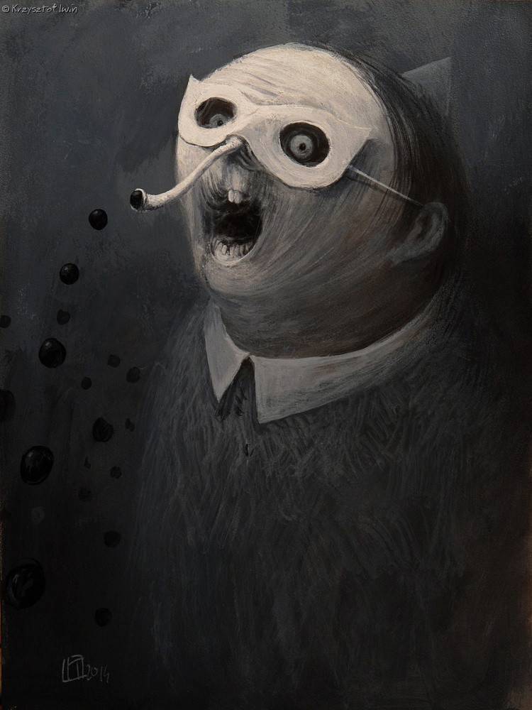Obraz ma ciemne, stonowane barwy, głównie odcienie szarości, które tworzą mroczną atmosferę, wręcz creepy. Na pierwszym planie widzimy dziwną postać, faceta z białą maską i rurką wystającą z ust, co przypomina jakieś senne koszmary. Wyraz twarzy jest przerażający, oczy szeroko otwarte, jakby coś strasznego go zdziwiło albo zaszokowało. Tło jest jednolicie ciemne, co podkreśla izolację bohatera. Artysta używa kontrastowych barw, a może to jest inna nazwa technika, która skupia naszą uwagę na detale. Styl jest surrealistyczny, przywołujący na myśl malarstwo ekspresjonistyczne, ale i coś z komiksów. Jest w tym coś niepokojącego, jak z odległych snów które nie chcą opuścić umysłu. Dla dzieciaka to dziwny człowiek z rurką, może chce dmuchać baloniki? Obraz budzi emocje niepokoju, zmieszania, ale i fascynacji, bo przecież każdy z nas czasem czuje się dziwnie inny. Wow, what a picture, można pomyśleć, patrząc na ten obraz, zastanawiając się nad jego głębszym znaczeniem. Jakby krzyczał, ale bez dźwięku. Możemy więc jedynie zgadywać, co naprawdę artysta miał na myśli.