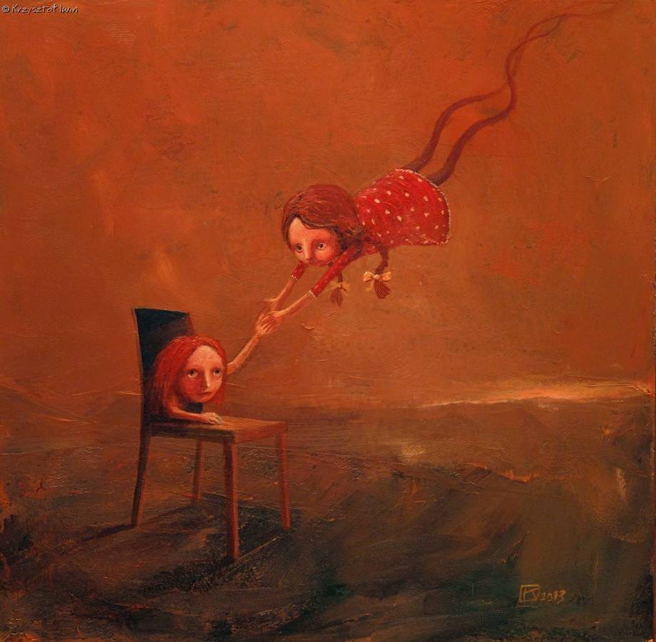 Obraz emanuje aurą tajemnicy i surrealizmu, przyciągając uwagę swoją niezwykłą kompozycją. Na tle rudobrązowej tonacji, dwie postacie zdają się zawieszone między rzeczywistością a snem. Dziewczynka w czerwonej sukience, unosi się nad krzesłem, wyciągając długie ramiona ku drugiej, siedzącej postaci. Jest takie coś magicznego, co przypomina bajkowy moment, jakby zaraz miały się zacząć czary. Coś takiego, co siedmiolatek określiłby jako "wow, ona leci!". Technika, którą użył artysta, to prawdopodobnie mieszanka oleju z akrylem, co nadaje miękkości i płynności. Ciepłe barwy, miedziane odcienie tworzą nostalgiczną i trochę niepokojącą atmosferę. Kompozycja jest zaskakująco dynamiczna, mimo że wszystko wydaje się być w stagnacji. To wrażenie ulotności wywołuje uczucie zadumy, a może i smutku. Emocje? Wzbudza ciekawość, ale też zastanawia nad sensem ludzkich połączeń, relacje te mają w sobie coś nieuchwytnego jak echo marzeń. What's the story behind? Można sobie zadać pytanie, co artysta chciał przekazać. Styl obrazu przypomina surrealistyczny realizm, zachęcający do własnych refleksji i interpretacji. Moim zdaniem, to dzieło mówi o wolności, a może o jej braku.
