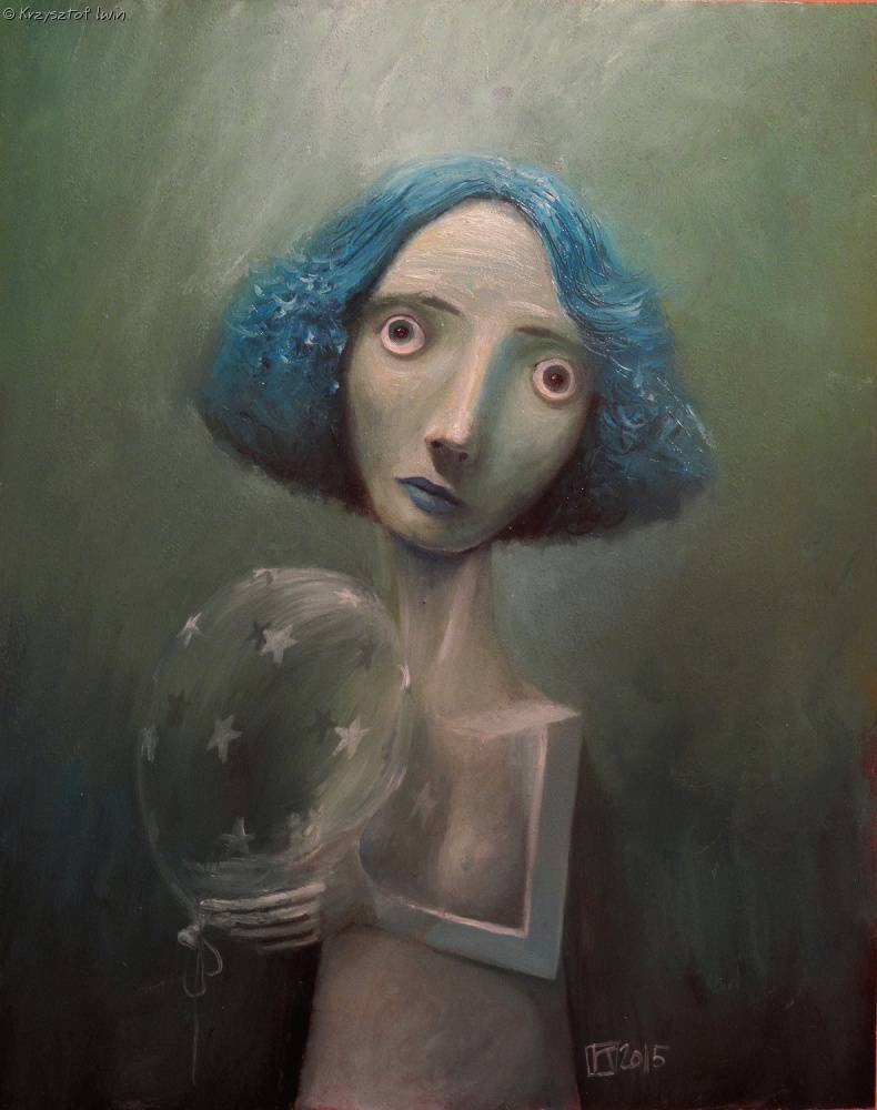 Obraz jest jak z innego wymiaru. Na nim postać z niebieskimi włosami i przenikliwymi, szeroko otwartymi oczami spogląda wprost na widza. Kolory są przytłumione, przeważają odcienie zieleni, z nutą niebieskiego, co nadaje całości nieco surrealistyczny, melancholijny nastrój. Kompozycja jest prosta, ale niepokojąca – patrząc na postać, można poczuć, jakby skrywała jakąś tajemnicę, jakby chciała coś powiedzieć, lecz milczy. Balon z gwiazdami, który trzyma, dodaje lekkiego, dziecięcego elementu, ale i nieco smutku. To balloon of dreams? Styl artysty wydaje się być inspirowany surrealizmem, chociaż można tu wyczuć też wpływy ekspresjonizmu. Technika jest wyrazista, z grubymi pociągnięciami pędzla, co nadaje teksturze głębi. Patrząc na obraz, można poczuć gęstość emocji – coś pomiędzy zadumą a delikatnym smutkiem. Czujesz, jakbyś był zmuszony do refleksji nad zagubieniem i pragnieniem ucieczki w świat marzeń. Obraz nie daje łatwych odpowiedzi, ale skłania do zadawania pytań: kim jest ta kobieta? Co myśli? Może ona chce iść na spacer z balonem po niebie! Obraz ten to metafora naszych wewnętrznych światów – pełnych sprzecznych emocji i skrytych tęsknot.
