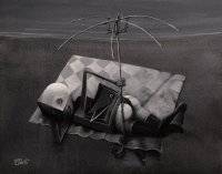 Na obrazie dominuje monochromatyczna paleta szarości, stwarzając atmosferę tajemnicy i zadumy. Kompozycja jest dość surrealistyczna: przedmioty wydają się zawieszone w przestrzeni, leżące na szachownicowej tkaninie. Kanciaste kształty i subtelne linie tworzą poczucie chaosu w uporządkowany sposób. Klimat obrazu jest melancholijny, jakby zatrzymany w czasie, co sprawia, że widz czuje się jak w innym świecie, a może trochę lost. Styl artysty łączy elementy współczesnego surrealizmu z abstrakcyjnym realizmem. Technika użyta w dziele sugeruje delikatne pociągnięcia pędzla, co dodaje mu głębi. Detale, takie jak delikatne cienie i subtelne przejścia tonalne, przyciągają wzrok, każą zatrzymać się na dłużej i zastanowić się nad ich znaczeniem. Może ma to sens, a może nie. Właśnie w tym tkwi czar tego obrazu. Praca ta wywołuje u odbiorcy wiele emocji: od poczucia zagubienia po fascynację. Można zadać sobie pytanie, co artysta chciał przekazać, jakie uczucia w nim wtedy grały. Być może niepewność, a może nostalgiczne wspomnienia. Patrząc na to, czuję, jakby czas zwolnił. Co to za magia, myślę sobie. Może to tylko sen, a może coś więcej, something else. Nawet dziecko mogłoby powiedzieć: "to wygląda jak z bajki, tylko gdzie są kolory?" Taki oto jest świat tego obrazu: fascynujący, intrygujący, pełen niewiadomych.