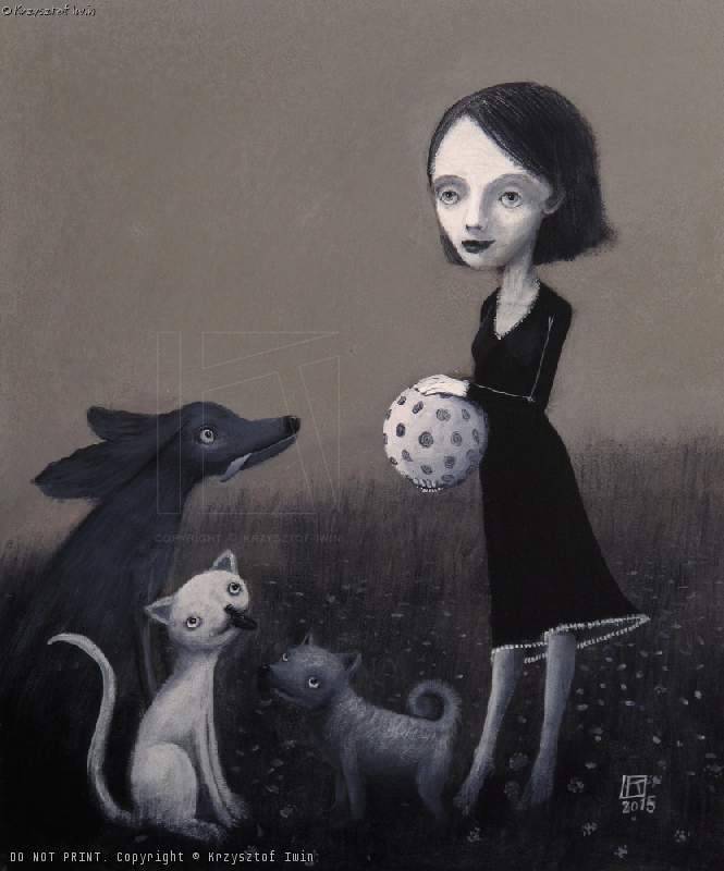 Na tym niezwykłym obrazie dominuje paleta stonowanych szarości. Postać dziewczynki w czarnej sukience trzymająca w rękach biało-czarną piłkę jest centralnym punktem kompozycji. Otaczają ją trzy osobliwe zwierzęta, kot i dwa psy, którzy wydają się wpatrywać w nią z zaciekawieniem. Ich duże, wyraziste oczy przyciągają uwagę. Całość jest naszkicowana w stylu nieco surrealistycznym, co dodaje obrazowi tajemniczości. Obraz emanuje atmosferą pewnego zdziwienia i niepokoju. Styl artystyczny przypomina prace wykonane techniką mieszanych mediów, z nutką vintage charm. Artysta użył delikatnych pociągnięć pędzla, by oddać fakturę powierzchni. Wydaje się, jakby czas na chwilę zamarł, co wprowadza widza w stan refleksji. Czy ta dziewczynka się bawi? Może właśnie zabiera swą magiczną piłkę w podróż pełną przygód. Obraz może wywoływać różne emocje, od zaciekawienia po lekki niepokój. Dla mnie ten obraz mówi: "zatrzymaj się, popatrz". Jest w nim coś z dziecięcej wyobraźni, coś, co sprawia, że chce się dłużej zatrzymać. Dzieciak powiedziałby: „Ta dziewczynka pewnie idzie grać z pieskami w piłkę!”. Może i to prawda, a może to tylko #imagination. Na pewno jest w tym obrazie coś magicznego, coś, co przyciąga jak magnes.