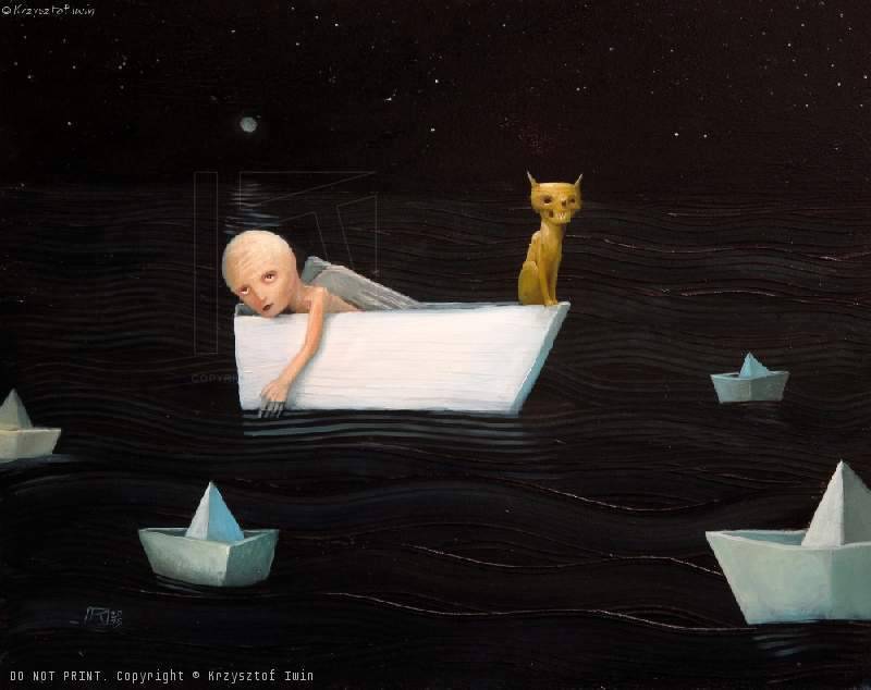 Obraz przedstawia tajemniczy świat, w którym dominują stonowane barwy z przewagą głębokiej czerni. Na pierwszym planie widzimy białą, lekko surrealistyczną łódź, na której leży postać z bladą skórą i skrzydłami, jakby była zagubionym aniołem. Obok niej siedzi złoty, czarujący kot, który wydaje się być strażnikiem tej sennej podróży. Po wodzie dryfują papierowe łódeczki, jakby chciały opowiedzieć swoje sekrety. Tło to ciemne, jak mroczna noc pełna tajemnic i niezbadanych ścieżek. Atmosfera jest jednocześnie melancholijna i magiczna. Niewielkie punkciki na niebie przypominają gwiazdy, dodając tej scenie odrobinę kosmicznego uroku. Styl obrazu jest czymś pomiędzy realizmem a surrealizmem, z popartowskim przekąsem. Emocje, które budzi to dzieło, to mieszanina ciekawości i niepewności. Dla niektórych może on być podróżą w głąb umysłu, dla innych – chwilą zatrzymaną w czasie. Dla mnie ten obraz to jak sen, inny world. Krótko mówiąc: coś niezwykłego. Czyżby sam wszechświat przemawiał przez te ciche fale? Może to jest tajemnicza przystań naszych marzeń, miejsce, gdzie wszystko jest możliwe. "Hej, jestem na łódce i płynę daleko, ale nie wiem gdzie!" – mówiłby pewnie siedmioletni poszukiwacz przygód. I coś w tym jest. Prawda rzeczywistości i fikcji splatają się w ten sposób, że można się w tym zagubić.