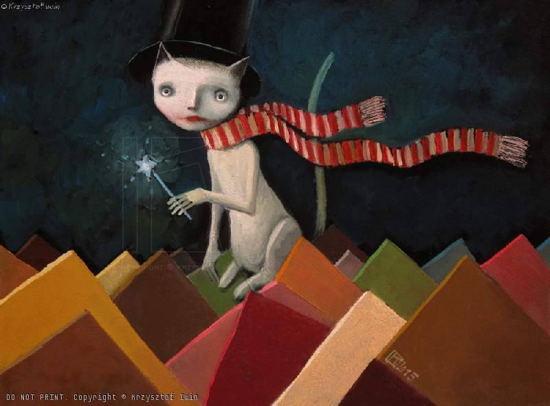 Na obrazie widnieje postać kota o wyrazistych, dużych oczach. Ubrana jest w czarny cylinder i pasiasty, czerwono-biały szalik, który zdaje się tańczyć na wietrze. Tło to głęboka czerń, kryjąca w sobie tajemnice nocy. Kot trzyma w łapce magiczną różdżkę, z której spływa delikatne światło. Może to magic wand? Wokół rozpościera się morze pomarańczowych i czerwonych trójkątów, przywodzących na myśl dachy domów albo góry. Atmosfera obrazu jest pełna magii i lekkości, ale też trochę zagadkowa. Jest w tym coś z baśniowego świata. Artysta użył miękkich przejść kolorystycznych, stawiając na kontrast między jasnymi trójkątami a ciemnym tłem. Technika, zdaje się, łączyć surrealizm z pewnym dziecięcym wdziękiem. Może nawet przypomina nieco marzenia senne? Patrząc na kota, można odczuć ciepło otulającego szalika, ale i tajemniczość jego spojrzenia. Może on magiczny jak Harry Potter? Dzieci na pewno powitałyby go z entuzjazmem. Obraz jest jak opowieść, do której chce się wracać, szukając nowych znaczeń i ukrytych emocji.