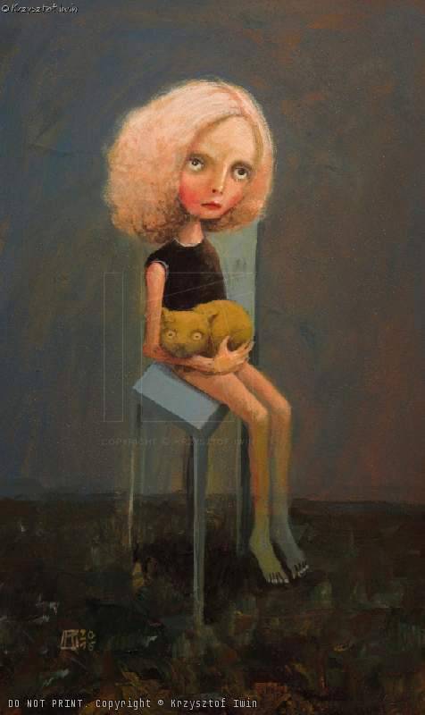 Obraz przedstawia dziewczynkę o jasnych, kręconych włosach i dużych oczach, która siedzi na prostym, niebieskim krześle. Ma na sobie czarną sukienkę. Trzyma na kolanach małego kota, który wydaje się być zrelaksowany i spokojny. Kolory są stonowane: przeważają odcienie brązu, zieleni i błękitu, co nadaje dziełu nieco melancholijny nastrój. Atmosfera obrazu jest trochę tajemnicza i nostalgiczna – coś jak wspomnienie z dzieciństwa, które próbujesz uchwycić, ale ono ciągle ci umyka. Styl artysty jest bardzo charakterystyczny. Użył on techniki olejnej, co widać po delikatnych przejściach tonalnych i bogactwie faktury. Kompozycja jest prosta, ale to ona dodaje siły emocjonalnej. Dziewczynka i kot stanowią centrum uwagi, ale całość jest osadzona w nieokreślonym tle, które dodaje obrazu nieco dream-like quality. Patrząc na ten obraz, można poczuć mieszankę spokoju i zadumy. Dziecko przypomina mi moją siostrę, gdy była mała i bawiła się ze swoim kotkiem. Może być też symboliczne – przypomnienie o prostocie i niewinności dzieciństwa. Myślę sobie, że każdy kiedyś tak miał – chwilę, kiedy świat na chwilę się zatrzymuje. Ten obraz może budzić tęsknotę za spokojem i bezpieczeństwem. Ilustracja może wywołać uśmiech, ale też lekki smutek. Jakbym zamknęła oczy, a potem je otworzyła, chciałabym tak się znów poczuć.