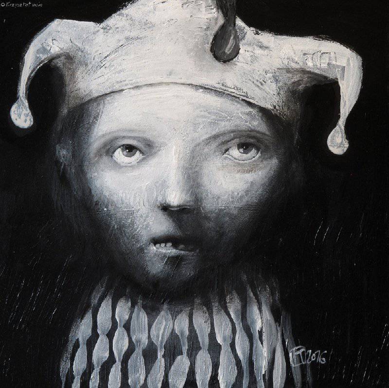 Obraz przedstawia zagadkową postać, klauna o chłodnym spojrzeniu, który zdaje się przenikać widza wzrokiem. Dominują czernie i biele, które tworzą kontrast pełen tajemnicy. Całość namalowana z dużą dozą detali, szczególnie w twarzy postaci, której oczy wyrażają jakąś dziwną, niepokojącą emocję. Czapka, z charakterystycznymi dwoma rogami, podkreśla komediowy, niemal groteskowy charakter postaci, co jednak nie wprowadza atmosfery radości, a raczej melancholii. To obraz, który wywołuje ciarki na plecach. Artysta zastosował technikę chiaroscuro, aby uzyskać głębię i dramaturgię. Farby olejne nadają teksturze gładkość, ale i zagadkowy blask. Widać, że ruch pędzla był przemyślany, a każdy detal miał swoje miejsce w kompozycji. Można by rzec, że obraz balansuje na granicy snu i jawy. Jakiś smutek i tajemnica kryją się w tych oczach. Możliwe, że chodzi o dualizm ludzkiej natury. Ten obraz sprawia, że człowiek zastanawia się nad prawdziwymi emocjami ukrytymi za maską uśmiechu. It's haunting, doesn't let you look away. Dziecko mogłoby powiedzieć: „On wygląda jak klaun z baśni, ale smutny”. Patrząc na to dzieło, czuję niepokój, ale i jakąś magnetyczną fascynację, której nie potrafię się oprzeć.
