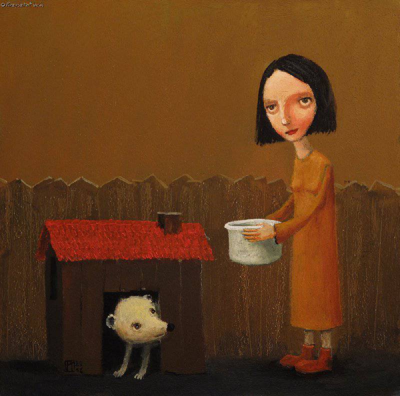 Obraz ukazuje dziewczynkę w długiej, pomarańczowej sukience, stojącą obok domku dla psa. Kolory są stonowane, ziemiste, z dominującymi odcieniami brązu i czerwieni, co tworzy ciepłą, nostalgiczną atmosferę. Kompozycja jest prosta, z dziewczynką po jednej stronie, a psem wystawiającym głowę z budy po drugiej. Artysta zastosował technikę przypominającą ilustracje z bajek, z lekko zniekształconymi postaciami, które dodają obrazowi surrealistycznego uroku. Obraz wywołuje ciepłe emocje, może budzić wspomnienia z dzieciństwa. Dziewczynka trzyma jasne wiadro, gotowa do opieki nad swoim pupilem. Właśnie to window pełne, a piesek wygląda jakby czekał na coś smakowitego. Może to być metafora troski i przyjaźni, uosabiająca niewinną miłość dziecka do zwierzęcia. Ten obraz mógłby powiedzieć: "Piesek jest super!". Przyglądając się z bliska, można dostrzec subtelne pociągnięcia pędzla, co świadczy o ręcznym wykonaniu i dodaje unikalności temu dziełu. Styl artystyczny jest bezpretensjonalny i swobodny, pozwalający na indywidualną interpretację. To kind of simplicity robi ten obraz naprawdę wyjątkowym, dając poczucie spokoju i ciepła.