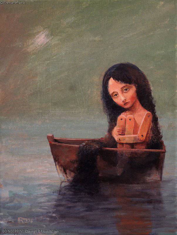 Obraz przedstawia tajemniczą scenę, gdzie lalka o ludzkich rysach siedzi w małej łódce na spokojnych wodach. Dominują tu zgaszone barwy – subtelne zielenie i błękity tworzą spójną całość z ciepłymi, brązowymi tonami łódki. Kompozycja jest prostota sama w sobie, a centralne umiejscowienie postaci przyciąga wzrok. Atmosfera obrazu jest pełna melancholii i spokoju, ale jednocześnie skrywa coś niepokojącego. Artysta zastosował technikę olejną, z miękkimi pociągnięciami pędzla, które dodają mu delikatności. Styl jest na granicy surrealizmu i realizmu, co dodaje tajemniczego uroku. Patrząc na ten obraz, czuję się, jakbym wszedł do snu – takiego trochę dziwnego, ale pięknego. "It's mysterious" – chciałoby się powiedzieć. Dzieciak pewnie by stwierdził: "Ta lalka wygląda na smutną!" I chyba coś w tym jest... Emocje wywoływane przez obraz są złożone – od nostalgii, przez zadumę, po lekką niepewność co do tego, co symbolizuje postać. To jakby otwarte zaproszenie do refleksji, które pozostawia widza z pytaniem "co dalej".