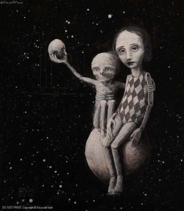 Obraz przedstawia surrealistyczną scenę dwóch postaci na tle czarnego kosmosu pełnego białych gwiazd. Pierwsza z nich to szkielet trzymający czaszkę, co może budzić skojarzenia z motywem vanitas. Druga to postać ubrana w kostium w romby, przypominający stroje arlekinów. Siedzą na kuli, która wydaje się unosić w przestrzeni, dodając kompozycji odrealnionego charakteru. Kontrasty między czernią tła a jasnymi elementami obrazu wzmacniają jego ekspresję. Atmosfera dzieła jest zawieszona między smutkiem a dziwną, oniryczną spokojnością. Czujemy chłodny mystique, jakbyśmy oglądali sen o końcu świata lub o jakiejś nieodgadnionej tajemnicy. Artysta posługuje się techniką światłocienia, co nadaje obrazowi głębi i trójwymiarowości, a także wprowadza pewne niepokojące napięcie. Patrząc na ten obraz, można poczuć mieszankę nostalgii i zagadkowości. Dzieci mogłyby powiedzieć, że to wygląda jak historia z dalekiej galaktyki. Dla mnie to coś w rodzaju "cosmic riddle". Emocje oscylują między poczuciem samotności a fascynacją nieznanym. Obraz zmusza do zatrzymania się i refleksji, budząc w nas pragnienie zrozumienia własnych marzeń i lęków.