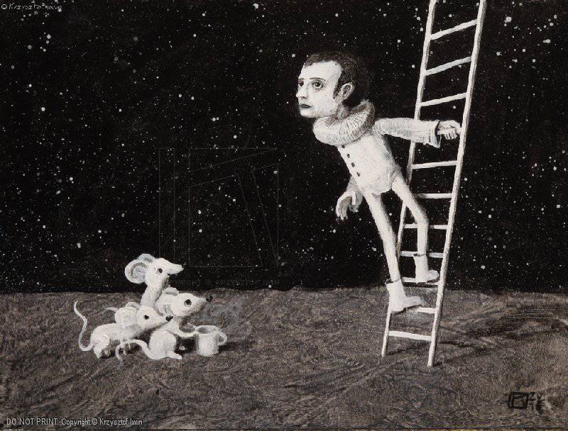 Na tym obrazie widzimy coś niezwykłego. Pod ciemnym, gwiaździstym niebem kroczy człowiek. Jego strój przypomina kostium kosmiczny, a wyraz twarzy jest pełen zamyślenia. Trzyma się drabiny, która wydaje się być mostem do gwiazd. Obok na ziemi, grupka małych myszek wpatruje się w niego z zaciekawieniem. Ich białe futerka kontrastują z ciemnym tłem. Atmosfera jest nieco surrealistyczna, jakbyśmy weszli do świata snu. Czujesz delikatny niepokój, ale i fascynacje. Styl artysty jest wyraźnie fantastical, z domieszką realizmu magicznego. Użycie ciemnych barw nadaje dziełu tajemniczy nastrój. Artysta bawi się proporcjami, wzmacniając poczucie dziwności. I love it! Można by rzec, że każdy element jest tu na swoim miejscu, choć jednocześnie nie pasuje nigdzie indziej. Obraz może wywołać wiele emocji – od zdumienia po refleksję nad samotnością człowieka w wielkim wszechświecie. Może myszki są jego jedynymi widzami, a może to one kontrolują ten sen. Nasuwają się pytania: Czy drabina prowadzi do spełnienia marzeń? A może na szczycie czeka coś zupełnie nieoczekiwanego? Mój pies też by tam wszedł, bo lubi drabiny! Obraz zachęca do zastanowienia się nad naszym miejscem we wszechświecie, wciągając nas w grę wyobraźni i emocji. Prawdziwy majstersztyk, który wtedy i tylko wtedy nabiera sensu, kiedy pozwolisz sobie na odrobinę marzenia.