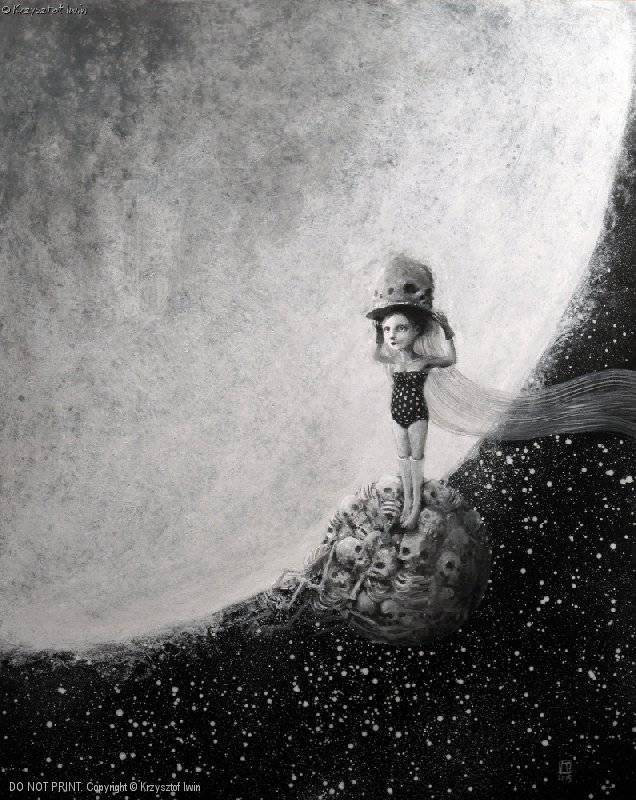 Obraz ukazuje postać dziewczynki stojącej na szczycie surrealistycznej kuli, pełnej twarzy i kształtów. Dominują odcienie szarości, które nadają kompozycji mroczny, nieco tajemniczy klimat. Dziewczynka ma nieco odrealniony wygląd, ubrana w czarny strój kąpielowy, a na jej głowie spoczywa duży, zaskakujący kapelusz. Czuje się niepokój, ale też pewne zaciekawienie. "Patrzcie, stoi na tych śmiesznych głowach!" powiedziałoby 7-letnie dziecko. Obraz wydaje się być jak sen, a raczej koszmar, w którym granica między fantazją a rzeczywistością się zaciera. Artysta posługuje się techniką przypominającą stare fotografie, z efektem ziarnistości dodającym głębi. Widoczna jest precyzja, ale też artystyczny chaos – płatek po płatku, linia za linią. Jest coś haunting, przyciągającego oko, co sprawia, że odbiorca czuje się jakby wkroczył w nieznany świat. Osobiście czułem jakby obraz mówił "spójrz na mnie, odkryj moje sekrety", a jednocześnie odsuwał od siebie. Zastanawia mnie, co sprawia, że nie można oderwać wzroku – to jakby tajemnica, która nie daje spokoju.
