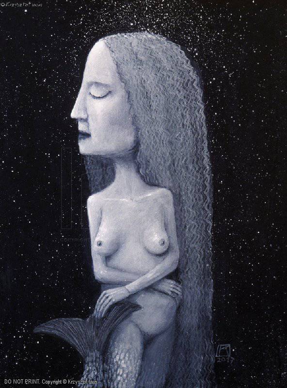 Obraz przedstawia tajemniczą syrenę na tle gwieździstej nocy. Jej postać jest zdominowana przez odcienie szarości i bieli, które kontrastują z ciemnym, niemal czarnym niebem. Długie, falujące włosy syreny zdają się zlewać z gwiazdami, tworząc surrealistyczną wizję. Kompozycja jest minimalistyczna, a jednocześnie pełna głębi. Artysta wykorzystał technikę impasto, co dodaje faktury i dynamiki. Atmosfera obrazu jest spokojna, niemal melancholijna. Syrena zdaje się zamyślona, z dala od zgiełku codzienności. Patrząc na ten obraz, czuje się, że czas się zatrzymuje. Może wywoływać refleksje nad samotnością i odosobnieniem, ale też zachwyt nad pięknem nieznanego. Dziecko powiedziałoby: "Ona pewnie szuka przyjaciół w gwiazdach!" Styl dzieła łączy surrealizm z nutą ekspresjonizmu, a delikatne pociągnięcia pędzla dodają mu magiczny vibe. Obraz może zasiać ziarno marzeń i tęsknoty za innym światem. Moim zdaniem jest w nim coś hipnotyzującego, co przyciąga wzrok i skłania do rozmyślań o własnych pragnieniach i snach.