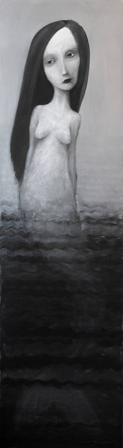 Obraz emanuje tajemniczością, z wyraźnym akcentem na postać kobiety wynurzającej się z mrocznej wody. Kolory są stonowane, dominują szarości, czernie i biele, nadając całości ponury nastrój. Sylwetka kobiety ma wydłużone, nieco surrealistyczne proporcje, co dodaje jej onirycznego charakteru. Woda wokół niej wydaje się falować w sposób nieco chaotyczny, sugerując niepokój i niepewność. Atmosfera obrazu jest zdecydowanie melancholijna, prawie jak cisza przed burzą. Kojarzy się z sennymi wizjami, gdzie granica między rzeczywistością a snem jest niewyraźna. Artystycznie, dzieło prezentuje styl gotycki z nutką surrealizmu, gdzie światło i cień bawią się rolami, by stworzyć iluzję głębi. Patrząc na ten obraz, można poczuć dziwną mieszankę smutku i zaciekawienia. Co dziecko mogłoby powiedzieć o tym obrazie? Może coś w stylu: „Ona wygląda jak księżniczka z innej planety!”. Emocje? No jasne! Widz czuje się jak gdyby zanurzał się w zapomniane, niemalże baśniowe historie. Ta abstrakcyjna postać, z niewzruszonym spojrzeniem, sprawia, że zastanawiamy się nad kruchością i ulotnością chwili. To dzieło, które może poruszać, bo jest profound i dające do myślenia.