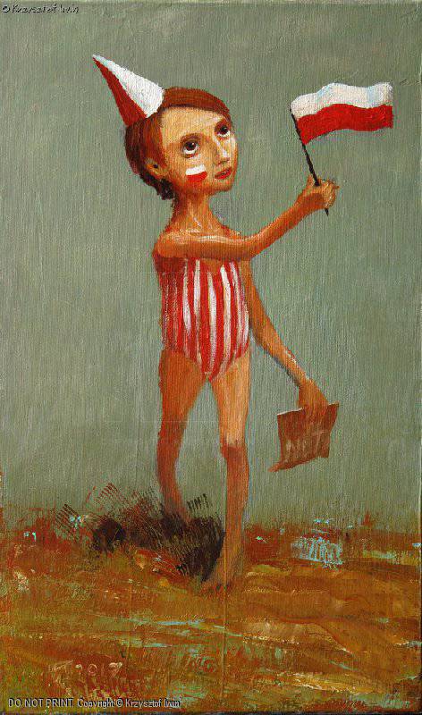 Obraz ukazuje postać dziecka w pasiastym kostiumie w biało-czerwonych barwach, trzymającego flagę Polski. Dominują odcienie ziemi, a tło w szarawych barwach dodaje kompozycji nieco melancholijny ton. Postać jest prosta, niemal naiwnie ukazana, co sprawia, że wydaje się ulotna i subtelna. W dziele czuć pewną nostalgię, jakby wspomnienie z dzieciństwa. Styl malarski przypomina naiwną sztukę z impresjonistycznym sznytem, z widocznymi pociągnięciami pędzla, które tworzą teksturę. Obraz może budzić różnorodne emocje: od ciepłego rozrzewnienia po refleksję nad przemijaniem. Może kojarzyć się z dziecięcą radością, ale i z delikatnym sensem patrzenia w przeszłość. Elementy takie jak dziecięca czapeczka i flaga dodają mu radosnego, patriotycznego elementu, co może budzić uśmiech. To jest special picture. Dziecko w centrum skłania do myślenia o niewinności i prostocie młodości. Patrzysz na to i myślisz: czyli jednak da się połączyć lightness z emocjonalnym ciężarem. Obraz przypomina widza o wartościach i uczuciach zakorzenionych głęboko w sercu. Mimo pozornej prostoty, kryje w sobie wiele warstw do odkrycia.