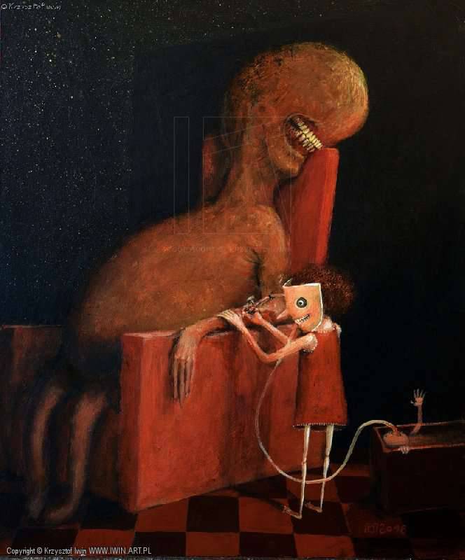 Obraz na pierwszy rzut oka uderza swoją zaskakującą paletą kolorów i dziwną kompozycją. Dominują ciemne, tajemnicze barwy - głęboka czerń oraz czerwień, które wprowadzają nastrój niepokoju. W centralnej części obrazu znajduje się przerażająca postać o dziwnym kształcie, z groteskowym uśmiechem i niejasnymi proporcjami. Obok niej stoi mniejsza postać w czerwonej sukience z maską na twarzy, trzymając w rękach jakieś narzędzie. Podłoga zdaje się być szachownicą, co dodaje surrealizmu tej scenie. Na pierwszy rzut oka, ten obraz jest trochę creepy, prawda? Nastrój, jaki emanuje z dzieła, jest duszny i tajemniczy, budząc uczucie dyskomfortu, ale jednocześnie ciekawość. Artysta zastosował tu technikę chiaroscuro, kontrastując światło i cień, co potęguje dramatyczność sceny. Ten obraz może wywoływać w odbiorcy różne emocje i interpretacje - niepewność, strach, ale także fascynację. Co się tu właściwie dzieje? Może to scena symboliczna, odniesienie do relacji między ludźmi, gdzie wszystko jest "upside down". Kiedy patrzę na ten obraz, czuję dreszczyk emocji, jakbym czytała nieukończoną, mroczną bajkę. Wow, ta scena jest naprawdę intrygująca!