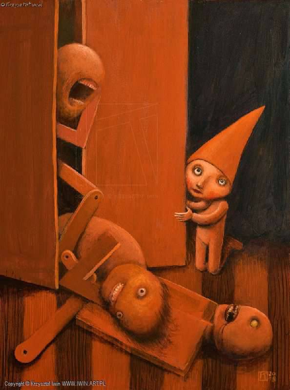 Na obrazie dominuje ciepły, brązowy kolor, który nadaje mu przytulny, choć lekko niepokojący charakter. Centralnym elementem kompozycji jest szafa, z której wysypują się lalki o nietypowo dużych głowach i przenikliwych, nieco przerażających oczach. Wszystko wydaje się jak z bajki, ale takiej z mrocznym podtekstem. Artysta z dużą precyzją i dbałością o szczegóły uchwycił prostotę form, wykorzystując płaskie plamy barw i delikatne cieniowanie. Technika jest w sumie bardzo charakterystyczna i przywodzi na myśl ilustracje z książek dla dzieci – ale takich, które opowiadają historie z "twistem". Obraz emanuje atmosferą tajemnicy i delikatnego niepokoju, jakby coś czaiło się tuż poza zasięgiem wzroku. Można niemalże poczuć, jakby postacie patrzyły prosto w duszę widza, przeszywając go na wskroś. Chill runs down the spine. Dziecko mogłoby pewnie powiedzieć: "Czemu te lalki mają takie dziwne uśmiechy?". Niezwykle sugestywne są ich wyrazy twarzy – uśmiechy są nieco wymuszone, jakby ukrywające sekret. Każdy, kto patrzy na to dzieło, może poczuć lekkie zaniepokojenie, może nawet zadumę nad tym, co ukryte we wnętrzu szafy. Interesujące połączenie dziecięcej prostoty z głęboką emocjonalną złożonością przyciąga uwagę i nie pozwala jej oderwać. To obraz, który na długo zostaje w pamięci.