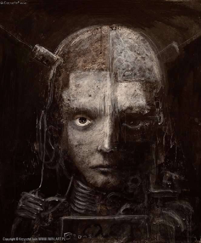 Obraz przedstawia tajemniczą postać, której twarz jest podzielona na dwie części. Lewa strona jest bardziej organiczna, z miękkimi liniami i subtelnymi cieniami, podczas gdy prawa jest metaliczna i mechaniczna, prawie jak android. Kontrast między ciemnymi, ponurymi barwami a jasnym, intensywnym spojrzeniem przyciąga uwagę. Atmosfera jest mroczna, nieco dystopijna, wzbudzając poczucie niepokoju i tajemnicy. Tak jak w filmie science fiction. Artysta stosuje technikę chiaroscuro, podkreślając napięcie między światłem a cieniem. To dziwnie wciągające dzieło emanuje chłodnym spokojem, ale i ukrytym dramatyzmem. Postać wydaje się patrzeć prosto w duszę, co może wywołać dreszcze albo zaciekawienie. Czy to człowiek, czy maszyna? Myślę, że to trochę creepy, ale fascynujące. Dzieciak powiedziałby: "Ale to wygląda jak robot!". Cała kompozycja sprawia, że zaczynasz się zastanawiać nad granicą między człowieczeństwem a technologią. Poczucie dualizmu jest tutaj silne, a emocje jak na rollercoasterze, zmienne jak pogoda. To dzieło prowokuje do refleksji nad przyszłością. Trudno od niego oderwać wzrok, chce się w nie wgapiać i zgłębiać jego tajemnice.