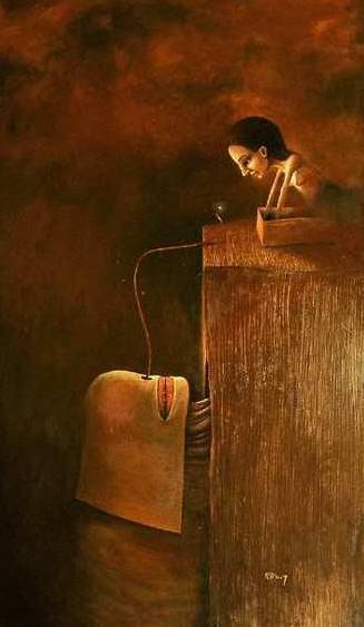 Obraz przyciąga wzrok ciepłymi, ziemistymi barwami – dominująca rdzawa paleta nadaje dziełu nostalgiczny charakter. Przedstawia mężczyznę siedzącego na wysokim stole, gapiącego się w coś ukrytego za krawędzią. Sznur, jakby mysz komputerowa, prowadzi w dół, gdzie niepewnie wyłania się z niego tajemniczy element. Ta kompozycja przywołuje oniryczną atmosferę, gdzie rzeczywistość miesza się z fantazją. Wyraz twarzy mężczyzny – skupienie i zaduma – emanuje spokój, ale i ciekawość. Można się zastanawiać, czy to scena refleksji, czy skrytego marzenia. Artysta używa miękkiego pociągnięcie pędzla, co nadaje obrazowi subtelności i ulotności. Jest coś magicznego w tej prostocie. Może to surrealizm, może symbolizm – ciężko powiedzieć, ale jakaś ukryta historia kryje się w tym dziele. Patrząc na to, można poczuć tę nieuchwytną tęsknotę za chwilą zawieszoną pomiędzy jawą a snem. Czy to tylko ja, czy ten obraz naprawdę coś mówi? Obraz sprawia, że zastanawiam się nad tym, co naprawdę chcemy zobaczyć poza horyzontem naszej codzienności. To małe okruchy refleksji, te elementy unexpected, które napotykamy w życiu. Wyobrażam sobie, że mógłby to być fragment z książki, gdzie każda linia opowiada inną historię. Mamusiu, co on tam widzi? – taka dziecięca ciekawość rodzi się na widok tej sceny. Kogoś obraz może zainspirować do własnych przemyśleń, a może do stworzenia własnego „co dalej” w tej wizji artysty.