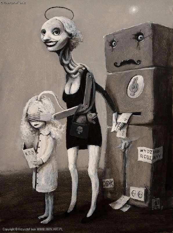 Obraz, pełen szarości i beżów, wprowadza widza w surrealistyczny świat. Już na pierwszy rzut oka widać postacie o nienaturalnych proporcjach: przytulną kobietę z anielskim nimbem nad głową i dziecko o zasłoniętych oczach. Kobieta przedstawiona jest jako marionetka, z mechanicznymi rękami, co daje wrażenie niepokoju. Obok stoi robot, smutny i sztywny, z ironicznymi wąsami. Razem, te postacie tworzą kompozycję, która intryguje i przyciąga. Atmosfera obrazu jest jednocześnie groteskowa i melancholijna. Mroczna, a jednak ironiczna, może przypominać o zawiłościach życia rodzinnego. Styl artysty, inspirowany surrealizmem, łączy absurd i codzienność, każda kreska zdaje się opowiadać własną historię. Emocje są tu skomplikowane, obraz zmusza do refleksji na temat osądzania i niewinności. To jak sen, trochę dziwny, a jednak fascynujący. Całość może sprawić, że odbiorca poczuje się nieco "lost", ale też zaintrygowany. Mógłbyś pomyśleć: „Dlaczego robot jest taki smutny?” Moja siostra powiedziałaby: "Oni wyglądają śmiesznie!". Czasem życie jest takie, że nie wiesz, czy się śmiać, czy płakać.