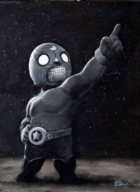 Na obrazie widzimy postać przypominającą superbohatera, stojącą dumnie z uniesionym palcem wskazującym ku górze. Utrzymany w odcieniach szarości, obraz ma monochromatyczny charakter, co nadaje mu tajemniczości i nieco mrocznego klimatu. Kontrastowe biele podkreślają oczy i odbijające światło zęby, które wydają się wręcz świecić na tle ciemnego, gwiezdnego nieba. Kompozycja skupia się na dynamicznej pozycji postaci, co sugeruje nutę buntu czy wezwania do działania. Atmosfera emanuje siłą i pewnością siebie. Styl obrazu przypomina komiksy z lat 60., z wyraźnymi konturami i surowymi liniami. Artysta użył techniki malarskiej charakteryzującej się grubymi pociągnięciami pędzla, co dodaje tekstury i głębi. Patrząc na ten obraz, można poczuć dreszczyk ekscytacji. Miałem wrażenie, jakby zaraz miał zacząć mówić "Let's go!". Może być interpretowany jako symbol determinacji i odwagi w obliczu wyzwań. Fajna ta postać, chciałbym być jak ona. Obraz może wzbudzać różnorodne emocje, od podziwu po lekki niepokój związany z jego tajemniczą aurą.