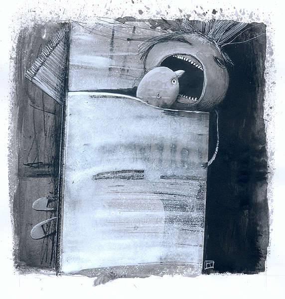 Obraz jest intrygujący i może budzić różne emocje. Przedstawia postać z otwartymi ustami, podkreślonymi przez kontrast szarości i czerni. Całość utrzymana jest w stonowanej kolorystyce, z dominacją czerni i bieli, co nadaje dziełu surowy, enigmatyczny charakter. Kompozycja przywodzi na myśl senne marzenia lub bardziej mroczne zakamarki wyobraźni. Stylistycznie przypomina szkice wykonywane tuszem, gdzie intensywność cieniowania i linie tworzą dramatyczny efekt. Jak mówiłem do mamy, wygląda to trochę jak z książki o potworach. Technikę można opisać jako ekspresyjną, z odważnymi pociągnięciami i wyraźnymi detalami. Obraz wywołuje poczucie zaskoczenia, może też niepokoju. Można pomyśleć o kontrastach życia, a także o tym, co ukryte w zakątkach naszej psychiki – prawie jak ukryty message, ha! Wywołuje to pewną refleksję na temat ludzkich strachów i fascynacji tym, co nieznane. Dzieło zdaje się zapraszać do introspekcji, zachęcając odbiorcę do rozwinięcia własnej interpretacji. Czuć pewną energię i dynamikę, mimo na pozór statycznego motywu. Po prostu wow.