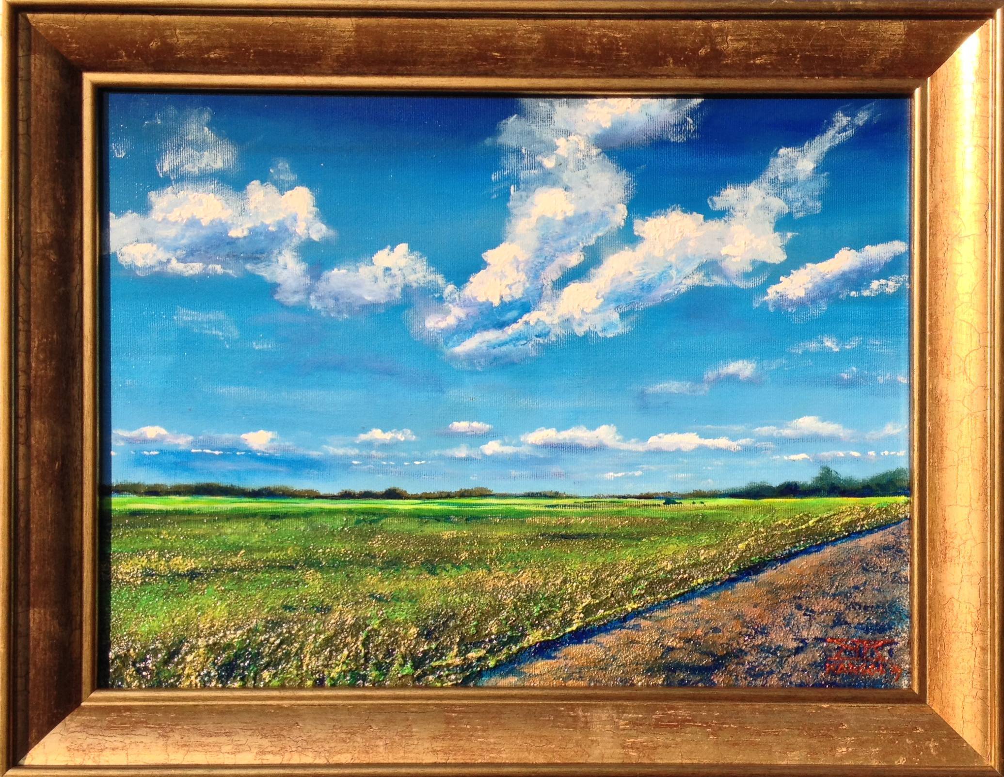 Obraz przedstawia rozległy pejzaż, gdzie niebo, pełne białych, puszystych chmur, dominuje nad spokojnym, zielonym polem. Kolory są intensywne – błękit nieba kontrastuje z żywą zielenią traw. Kompozycja jest prosta, horyzont jest niski, a oczy widza naturalnie podążają ku chmurom. Całość emanuje spokojem i ciepłem letniego dnia. Miękkie pociągnięcia pędzla sugerują delikatny wiatr, poruszający trawy. Ten obraz ma w sobie coś z nostalgic dream z dzieciństwa – jakby uchwycił idealny dzień na wsi. Artystyczne techniki użyte przez twórcę przypominają impresjonizm, co dodaje dziełu dynamizmu i lekkości. Widz może poczuć ulgę i wyciszenie, wpatrując się w ten krajobraz, niemal słysząc śpiew ptaków i szelest liści. Czuję, jakbym mógł tam stanąć i po prostu oddychać. Niebo wygląda jak ocean z białymi wyspami chmur. “Chciałbym skakać po tych chmurkach!” – to zdanie mogłoby powiedzieć dziecko, patrząc na ten obraz. Zdecydowanie jest to obraz, który przyciąga wzrok i wprowadza w stan błogiego spokoju.