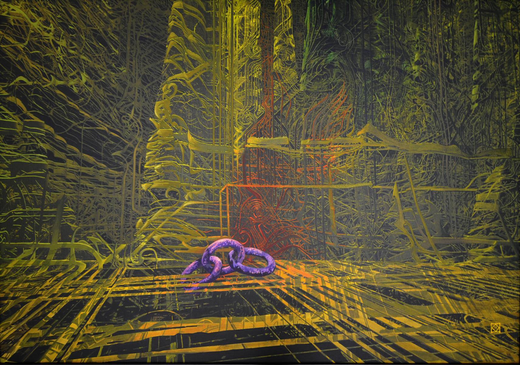 Obraz tętni kolorami. Dominują w nim głównie zielenie i żółcie, które splatają się w skomplikowaną sieć linii i kształtów. Z daleka może się wydawać jak zawiła dżungla zbudowana z geometrycznych wzorów. Centralnym punktem kompozycji jest fioletowy kształt, który przyciąga wzrok niczym magnes. Czy to wąż, czy może pętla? Tego nie wiadomo. Artysta z pewnością bawił się perspektywą i światłem, tworząc aurę enigmy. Nastrój obrazu jest tajemniczy, trochę jak z futurystycznego snu. A może to jakieś techno-landscape? Takie właśnie myśli mogą przyjść na myśl. Moje dziecko powiedziało: "To wygląda jak wirujący świat!” Styl jest wyrazisty, może nieco psychodeliczny. Pędzel artysty maluje linie z energią i pewnością, co nadaje całości dynamizmu. We wszystkich tych zawirowaniach można doszukać się głębszych emocji, poczucia zagubienia, a może spokoju w chaosie. Każdy zobaczy tu coś innego i to właśnie beauty of art. Fascynujące!