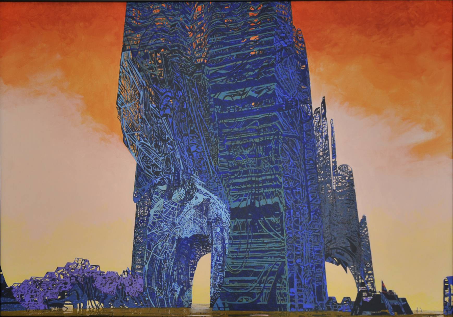Na obrazie dominuje ogromna, fantazyjna konstrukcja w intensywnym odcieniu niebieskiego, stojąca na tle pomarańczowego, złotego nieba. Tajemnicze, organiczne kształty budowli przypominają labirynt linii i wzorów. Kolory są żywe, kontrastujące, dodając dziełu dymamicznej energii. W tle, niebo zdaje się gorzeć, przywodząc na myśl koniec dnia lub magiczny świat. Atmosfera obrazu jest enigmatyczna i trochę surrealistyczna. Patrząc na ten obraz, czuję lekki dreszczyk. Niby jesteśmy tu, na Ziemi, ale jednak nie tak do końca. Artysta zastosował prawdopodobnie technikę digital painting, gdzie szczegóły są precyzyjnie odwzorowane. Struktura obrazu przyciąga wzrok, prowokując do zgłębienia tajemnicy przedstawionej sceny. Coś w tym jest z magicznego realizmu. Wygląda jak kadr z filmu science fiction. Wow, takie wielkie budynki są super! Możliwe, że odbiorca poczuje się na chwilę przeniesiony do innego świata. Obraz wywołuje marzenia o przyszłości i pytania w stylu “What if?”, zastanawiając nad tym, co może przynieść przyszłość architektury. To imponujące, jak kolory mogą wpływać na emocje. Jesteśmy świadkami wizji, która łączy naturę z technologią, przeszłość z przyszłością.