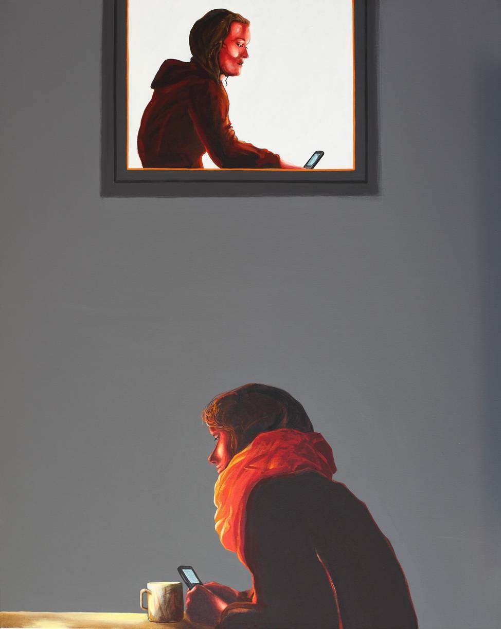 Obraz przedstawia postać zatopioną w myślach, siedzącą przy stole z kubkiem i telefonem. Kolory są dość stonowane, dominuje szarość, a ciepłe odcienie czerwieni i pomarańczu tworzą kontrast na postaci ubranej w płaszcz i szal. To dzieło emanuje spokojem, ale i nutą samotności, co nadaje całości lekko melancholijny klimat. Kompozycja obrazu wydaje się prosta, ale przemyślana, z dominującą przestrzenią pustki wokół, co podkreśla izolację bohatera. Artysta użył techniki, która przypomina olejne malarstwo, z wyraźnymi pociągnięciami pędzla, dodającymi swoistego charakteru. Na pierwszy rzut oka obraz może wydawać się minimalistyczny, ale detale w światłocieniu pokazują coś więcej. Czujesz tę ciszę, prawda? Może wywoływać uczucia refleksji nad codziennością i ucieczką w świat cyfrowy. Dziecko powiedziałoby: "Pan siedzi i patrzy w telefon, jak ja czasem." I to jest właśnie to. Obraz ukazuje współczesną scenę z życia, na którą każdy z nas może spojrzeć i pomyśleć, hmm, that's life. Lekkie odbicie światła na kubku daje wrażenie przytulności miejsca, izolowanego od zgiełku świata, tworząc przestrzeń do introspekcji. Może brakuje tu trochę dynamiki, ale właśnie statyczność postaci sprawia, że czujemy się zaintrygowani.