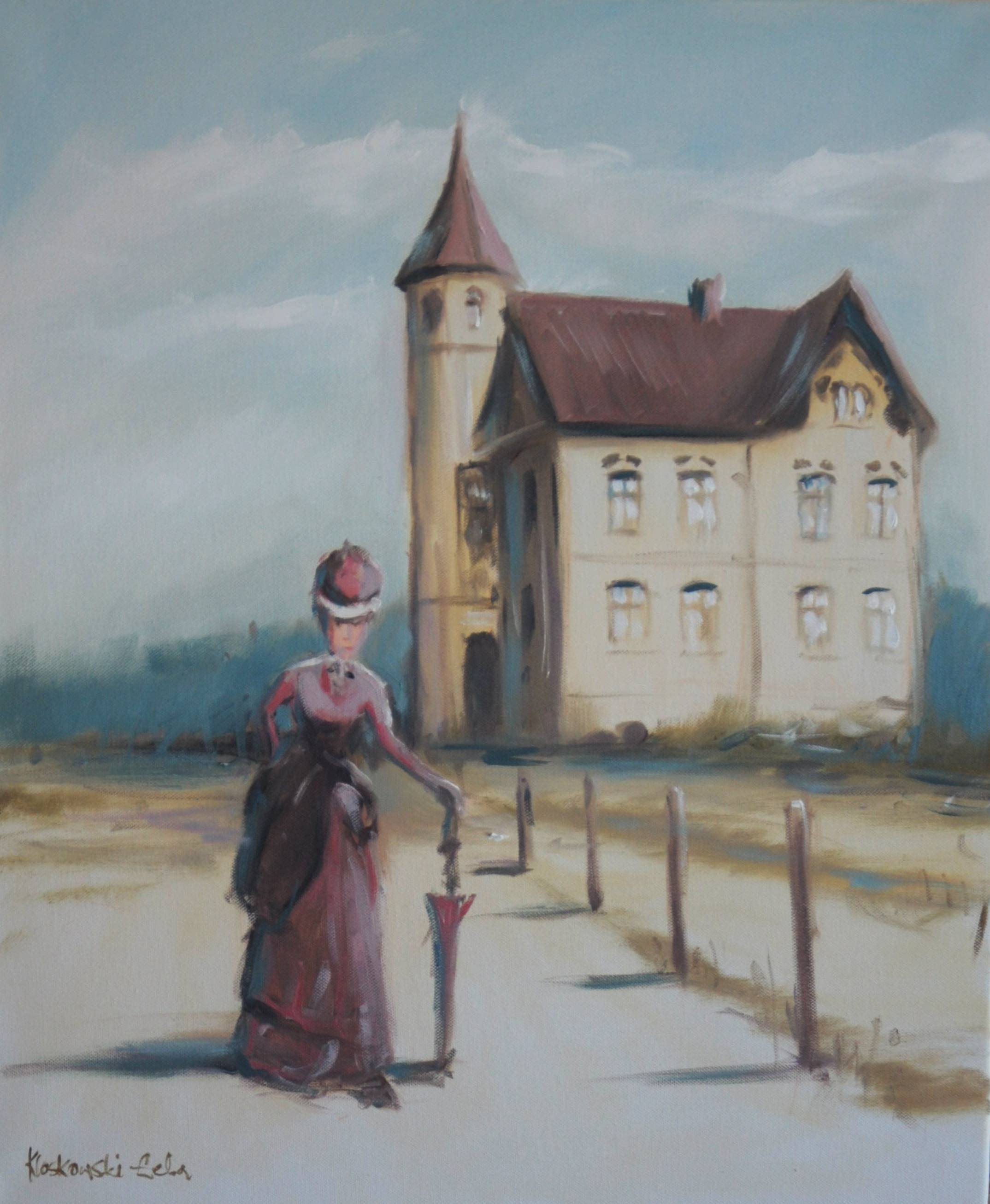 Na obrazie dominuje delikatna paleta pasteli – błękity i beże tworzą spokojną i nostalgiczną atmosferę. Kobieta w eleganckiej, bordowej sukni ze starannie ułożonym kapeluszem stoi przed majestatycznym budynkiem, który przypomina stary zamek. Jej sylwetka jest smukła, wręcz eteryczna, co podkreśla wysunięty kapelusz i parasolka delikatnie oparta o ziemię. Całość kompozycji daje wrażenie dawno minionych czasów, jakbyśmy przenieśli się w przeszłość. "Wow, ale fajowy zamek!" – krzyknęłoby małe dziecko, patrząc na obraz. Artysta posłużył się miękkimi pociągnięciami pędzla, które dodają obrazowi tajemniczości i subtelności. Styl malarski jest impresjonistyczny, a zastosowana technika nadaje dziełu jakby mgielny efekt "blur". Patrząc na ten obraz, czuję lekką tęsknotę i melancholię – jakby świat przedstawiony był tylko snem. Może ktoś z publiczności poczuje przypływ ciepłej nostalgii, może skłoni do zadumy nad czasem i przestrzenią. Cóż za magic moment!
