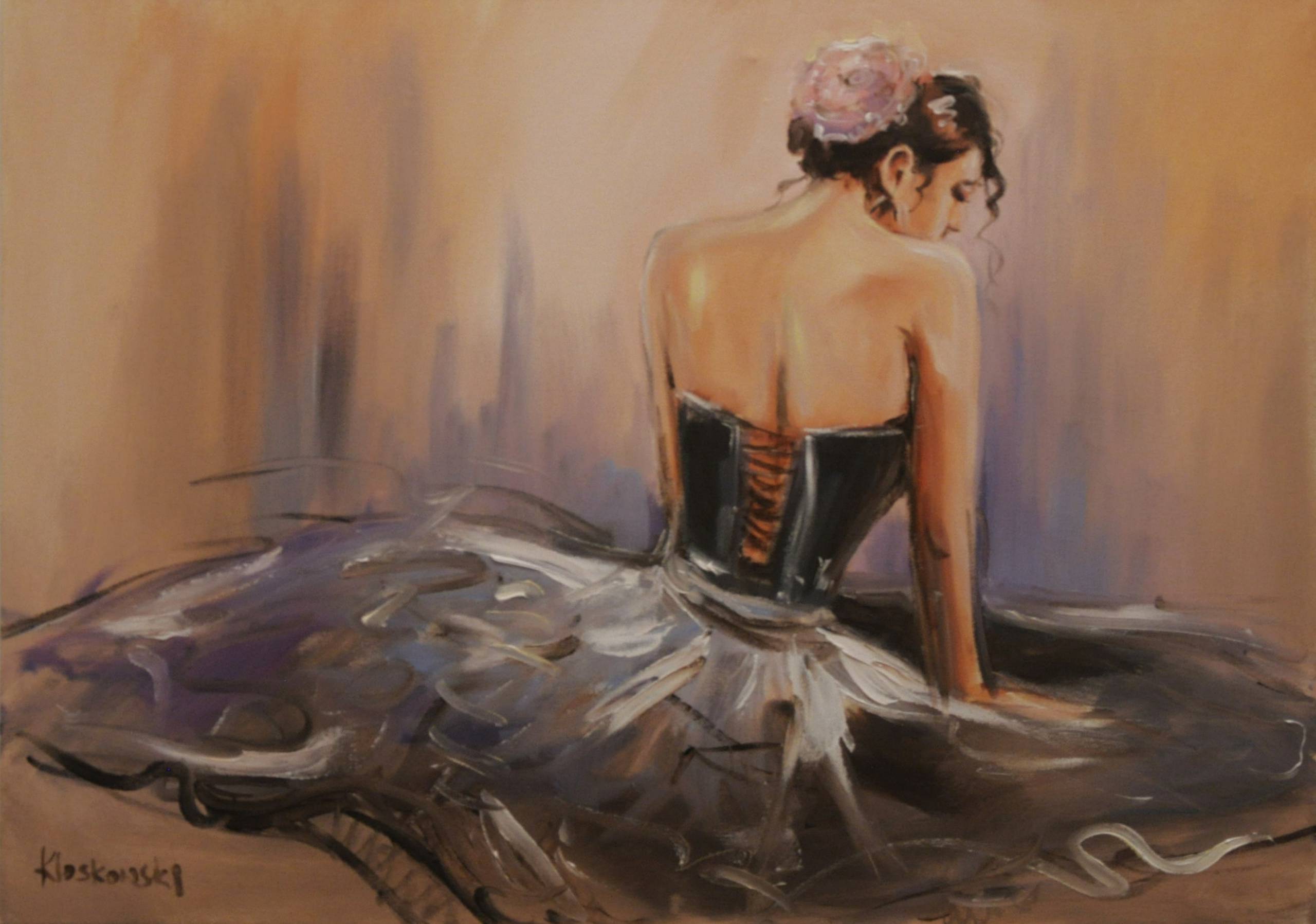Obraz przedstawia balerinę siedzącą tyłem, otuloną w cienie mlecznobiałej sukni, która niczym mgła rozlewa się wokół niej. Tło to delikatne smugi beżu i fioletu, które tworzą subtelne, niemal mistyczne tło. Kompozycja skierowana jest ku centrum, skupiając uwagę na centralnej postaci, jakby cała scena mówiła: "spójrz tutaj". Panujący nastrój to mieszanka melancholii i spokoju. Można niemal usłyszeć ciche echo muzyki klasycznej, która zdaje się unosić w powietrzu. Technika malarska zdradza ruch pędzla, not quite perfect, dzięki czemu obraz jest dynamiczny i pełen energii. Jest tu pewna impresjonistyczna lekkość, jakby artysta uchwycił chwilę w ruchu. Patrząc na balerinę, można poczuć jej zagłębienie w sobie, jej skupienie i marzenie. Może właśnie przygotowuje się do występu, a może wraca myślami do minionych chwil. 7-latek mógłby powiedzieć: "Ona wygląda jak księżniczka z bajki". Ciepło barw przeplata się z chłodem refleksji, co robi obraz jeszcze bardziej tajemniczym. Osobista refleksja może być tu pełna nostalgii. Może przypomina mi to chwile, gdy sam się zatrzymałem i zastanawiałem nad kierunkiem swojego życia. Niesamowite, jak jedno dzieło potrafi obudzić tak wiele emocji i wspomnień.