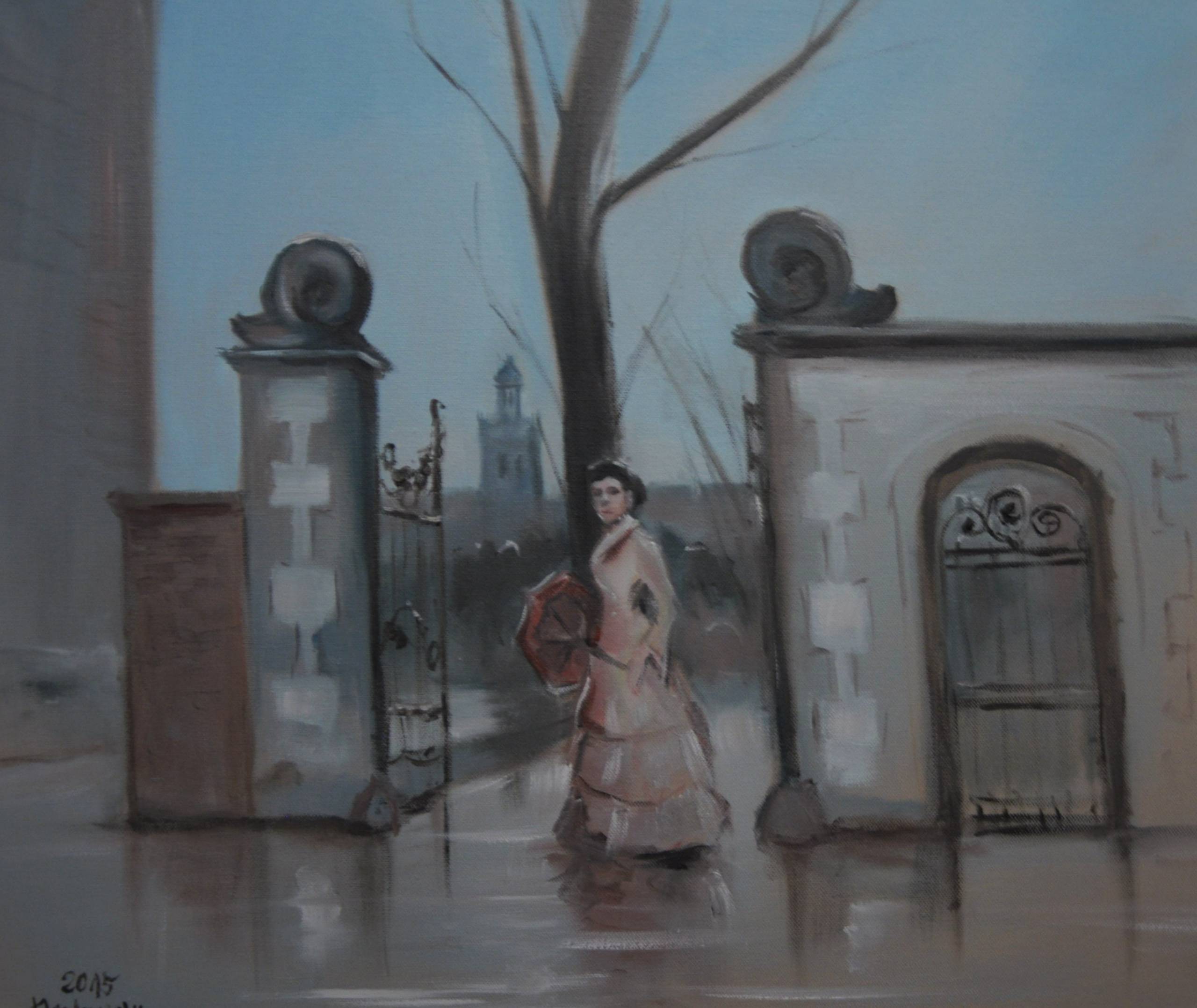 Obraz tchnie spokojem i nieco nostalgiczną atmosferą wypełnioną pastelowymi kolorami. Na pierwszym planie widzimy elegancką panią trzymającą parasolkę. Ta scena, będąca echem minionych czasów, odznacza się subtelną kompozycją. Stare mury bramy z koronkową kratą, w tle smukłe drzewa i zamglona wieża tworzą, jakby z innego świata, nostalgiczną iluzję. Delikatne, eteryczne pociągnięcia pędzla dodają całości lekkości. Obraz emanuje spokojem z delikatnym cieniem melancholii, przywodząc na myśl chłodny, wietrzny dzień po deszczu. Styl artysty to połączenie realizmu z nutą impresjonizmu, co potęguje wrażenie ulotności chwili. Technika pociągnięć pędzla, zastosowana tu z mistrzostwem, daje wrażenie ruchu i życia. Dla mnie ten obraz to spacer po wspomnieniach, chwila zadumy nad upływającym czasem. Dla dziecka jednak może być to po prostu "pani z ładnym parasolem, która idzie sobie powoli". Czy to nie jest dreamlike? Każdy widzi coś innego – dla jednych to spokojna sielanka, dla innych nostalgiczna podróż do przeszłości.