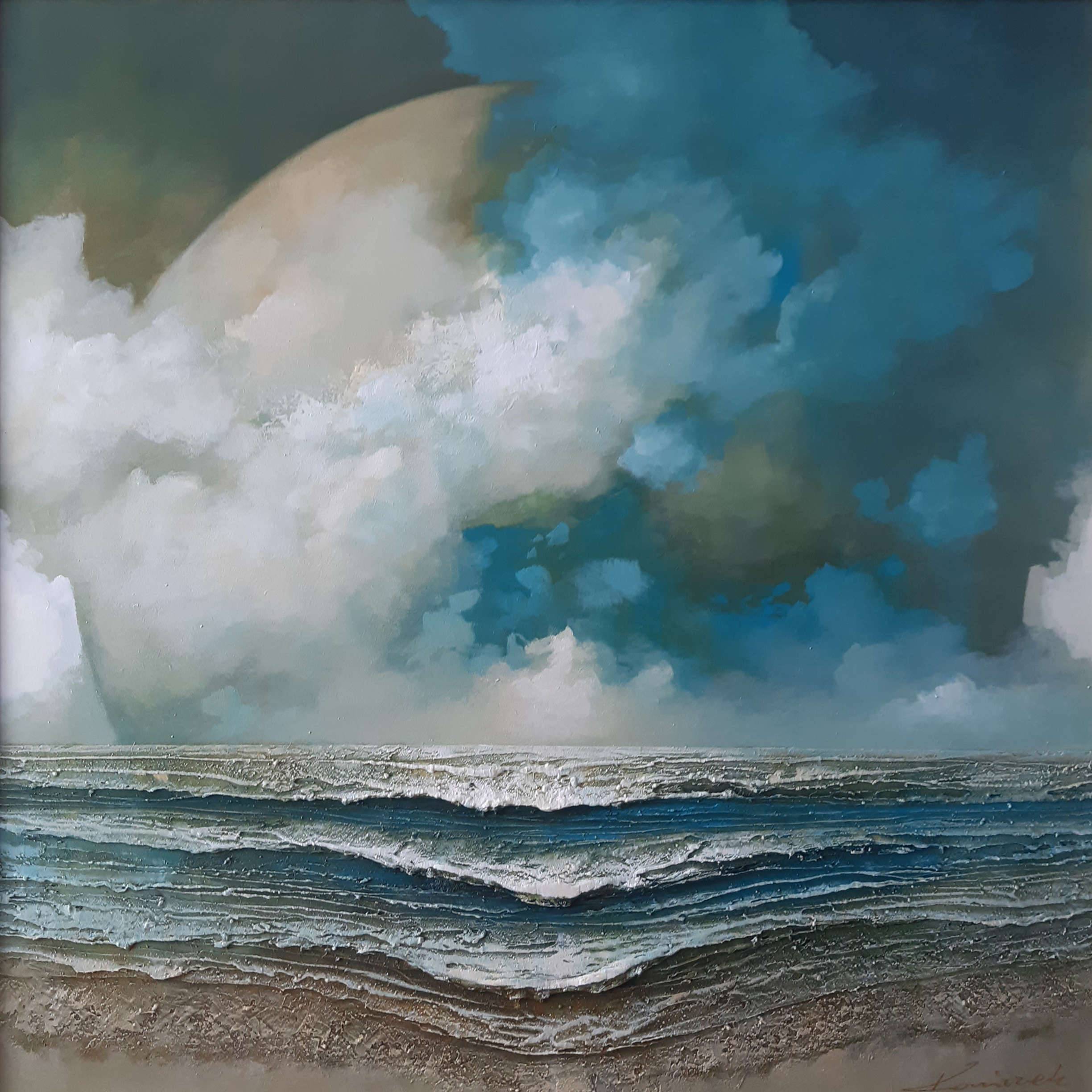 Obraz przedstawia nieuchwytną przestrzeń, gdzie turkusowe fale oceanu spotykają się z ciężkimi, puszystymi chmurami. Kolory są nasycone, dominuje bogaty błękit i zielenie, które przechodzą w subtelne odcienie szarości i bieli. Kompozycja jest dynamiczna, lecz jednocześnie emanuje spokojem, którego źródłem są płynne przejścia pomiędzy poszczególnymi elementami dzieła. Artysta zastosował technikę impasto, dzięki czemu powierzchnia obrazu przypomina strukturę fal, a to dodaje mu trójwymiarowości. Wygląda to jak żywe wspomnienie z wakacji nad morzem. Atmosferę można by opisać jako "otherworldly" — prawie nadprzyrodzoną. Nastr ó j jest dreamy, tajemniczy i pełen nieokreślonego oczekiwania. To dzieło może wywoływać u widza uczucie nostalgię, poczucie zagubienia lub tęsknoty za spokojem. Na marginesie, to jest naprawdę cool, jak sztuka potrafi poruszać emocje. Dzieciak mógłby pomyśleć, że to planeta morza, gdzie delfiny latają w chmurach. Obraz wydaje się opowiadać historie o miejscach, które być może nigdy nie istniały, a które mimo wszystko są niesamowicie znajome. Kiedy patrzę na to dzieło, czuję zar ó wno wewnętrzny spok ó j, jak i radosne podniecenie przed odkrywaniem nieznanej, magicznej krainy.