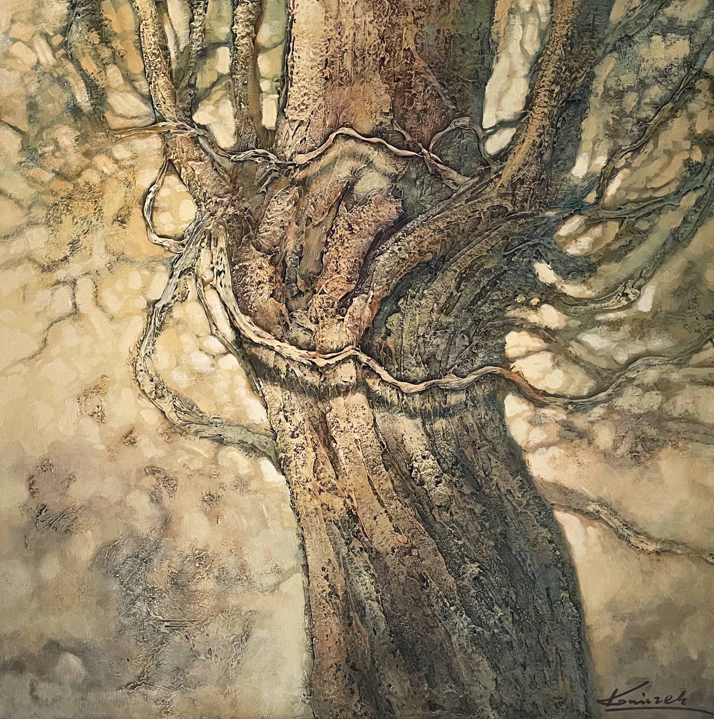 Na obrazie widzimy majestatyczne drzewo, którego konary oplatają się jakby w tańcu. Kolory przypominają paletę subtelnych brązów i zieleni, które stapiają się w jedną, harmonijną całość. Tło jest zamglone, co nadaje kompozycji lekko oniryczny klimat. Można by rzec, że całe dzieło emanuje spokojem i delikatną nostalgią. Artysta zastosował technikę impasto, dzięki czemu tekstura kory niemalże wychodzi z obrazu. Czujesz, że mógłbyś jej dotknąć i poczuć tę szorstkość pod palcami. To jest... magiczne. Obraz odzwierciedla siłę natury, jednocześnie zapraszając do kontemplacji nad jej pięknem. Drzewo wygląda jak jakiś bohater z bajki, może być przyjacielem. Ta nieco rustykalna stylistyka sprawia, że widz przenosi się myślami do tajemniczego lasu. To jest jakby powrót do korzeni, dosłownie i w przenośni. Każdy sęk i zakręt na drzewie opowiada swoją historię. Tak, to naprawde fascynujące, jak detal potrafi wzbudzić emocje. Nie sposób nie zastanowić się nad tym, co drzewo widziało, jakie tajemnice w sobie kryje. Jak dla mnie, to jest po prostu breathtaking.